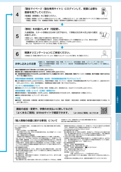 受講開始までの流れ認定の確認・取得入塾申込学費の支払い「塾生マイページ(塾生専用サイト)」にログインして、受講に必要な登録を完了してください。「受講証(時間割)」をご確認ください。※「受講証(時間割)」はスタート学期は2024/12/13(金)、1学期は2025/4/1(火)以降に塾生マイページにてご確認いただけます。「受講証(時間割)」では、受講講座の時間割・教室名・使用教材や注意事項をご確認いただけます。「教材」をお届けします(宅配便)。入金確認後、スタート学期は2024年12月下旬から、1学期は2025年4月上旬から順次お届けします。※講座により、事前にお届けする教材がない場合があります。※お申し込み・ご入金が受講直前の場合や、お住まいの地域や配送センターの稼働状況によっては、教材のお届けが受講開始日に間に合わない場合もございますので、余裕をもってお申し込みください。詳しくは、下記Webサイトの「よくあるご質問」をご覧ください。開講オリエンテーションにご参加ください。※詳細は「各種ご案内ダウンロード」より「開講オリエンテーションのご案内」をご確認ください。3456お申し込み上の注意※講座には、受験対策講座(対面/映像/オンライン)、目的別講座(映像/e-ラーニング)があります。基本となる受験対策講座(対面/オンライン〈総合型・学校推薦型選抜対策プログラムを除く〉)を1講座以上、選択してください。●必ず保護者等の方の了承を得たうえでお申し込みください。●定員に達した講座は受付を締め切りますので、お早めにお申し込みください。●一部受講希望校舎窓口でのみお申し込みを受け付けている講座があります。詳細は別冊「高校グリーンコース時間割」冊子の講座一覧またはWebサイトをご確認ください。受験対策講座の映像授業/目的別講座/総合型・学校推薦型選抜対策プログラムについて●上記の講座のみのお申し込みはできません。受験対策講座(対面/オンライン〈総合型・学校推薦型選抜対策プログラムを除く〉)と組み合わせてお申し込みください。なお、目的別講座は、受講開始後の講座の変更・取りやめはできません。オンライン個別指導講座について●受講前にオンラインにて学習プランの作成(有料)を実施します。各校舎または、Webサイトからお申し込みください。個別指導講座(対面)について(広島校・福岡校のみ)●受験対策講座の「個別指導講座」のお申し込みは、受講希望校舎窓口でのみ承ります。受講希望校舎へお電話ください。●事前に学習内容の相談(ヒアリング)を行います。その他●現役館®・現役生教室・秋葉原館・藤沢館での受講を希望される方は、別紙『現役館®・現役生教室・秋葉原館・藤沢館の講座を受講される場合』を必ずご覧ください。講座の追加・変更や、学費のお支払いに関してなどの「よくあるご質問」はWebサイトで確認できます。「よくあるご質問」はこちら▶「個人情報の保護に関する事項」について河合塾グループは、お客様が記入された個人情報を厳重に取り扱い、適正な個人情報の管理を実施します。ログインⅠDを登録する際に、Web画面に表示される「個人情報の保護に関する事項」もよくお読みください。①利用目的・お申し込み手続き、および確認の連絡・個人を特定できない方法・形式による統計資料の作成、および各種アンケートなどによる資料作成協力の依頼・教材、時間割の送付など授業運営・学籍簿の作成や保護者会のご案内などの各種ご連絡ほかクラス運営(入塾の場合)なお、記入された「カナ氏名」「生年月日」などの項目を利用して、河合塾グループが主催する講習、模擬試験、イベントなどへのご参加の履歴情報と結びつけ、進学や進路選定、および学校生活にお役に立つ情報の提供をはじめとする河合塾グループからの各種ご案内や、進学後に登録できる河合塾同窓会(ALUMNI)のご案内、河合塾グループの法人が運営する卒業後の進路選択に寄与するサービス等のご案内をさせていただくこともございます。②個人情報提供の任意性個人情報の提供は任意です。ただし、提供されない個人情報がある場合、上記①の利用目的に記載の諸手続きや処理、またサービス提供などに支障が生じる場合があります。あらかじめご了承ください。③個人情報の訂正・削除個人情報の訂正・削除を希望される場合は、その旨お申し出ください。速やかに必要な手続きをお取りいたします。④個人情報の共同利用「個人情報の取り扱いに関する契約」を取り交わした河合塾グループ内の法人(教育関します。共同利用する法人の範囲は河合塾Webサイトをご覧ください。連事業を営む学校法人と株式会社)が、河合塾グループからのご案内のため共同利用www.kawaijuku.jp/privacy/#about_shared⑤個人情報の取り扱いの委託個人情報の取り扱いの一部または全部を、河合塾グループ内の法人以外に委託する場合は、個人情報を適切に取り扱っていると認められる委託先を選定し、「個人情報の取り扱いに関する契約」を取り