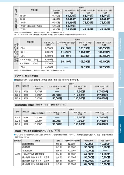 授業料スタート学期(1~3月)1学期(4~7月)2学期(9~12月)13講88,140円80,600円78,520円13講88,140円80,600円78,520円――47,190円――47,190円9講61,020円55,800円54,360円58,140円32,670円1講あたりの授業料6,780円6,200円6,040円6,460円3,630円授業分数150分120分90分90分(漢文文法・句形)75分高2生対面/映像受講開始までの流れ認定の確認・取得入塾申込学費の支払い授業料1講あたりの授業料スタート学期(1~3月)9講1学期(4~7月)13講2学期(9~12月)13講8,350円7,930円6,460円6,460円7,930円4,410円75,150円71,370円58,140円58,140円――108,550円103,090円83,980円103,090円57,330円108,550円103,090円83,980円103,090円57,330円授業分数180分150分90分スタート学期1・2学期60分90分150分高3生対面/映像/オンライン(集団)*上記以外の講数の講座は「1講あたりの授業料×講数」が授業料となります。*上記以外の講数の講座は「1講あたりの授業料×講数」が授業料となります。*高1・2エンリッチコース(東海高校・南山高校(女子部)対象)の授業料は千種校へお問い合わせください。オンライン個別指導講座●受講前にオンラインにて学習プランの作成(費用:1回45分1,500円)を行います。学年授業分数高1生高2生高3生90分90分90分1講あたりの授業料9,000円9,000円10,000円スタート学期(1~3月)9講――81,000円90,000円授業料1学期(4~7月)13講2学期(9~12月)13講117,000円117,000円130,000円117,000円117,000円130,000円個別指導講座(対面)広島校(高1・2生)福岡校(高1・2・3生)学年授業分数1講あたりの授業料高1生高2生高3生90分90分90分9,000円9,000円10,000円スタート学期(1~3月)9講――81,000円90,000円授業料1学期(4~7月)13講2学期(9~12月)13講117,000円117,000円130,000円117,000円117,000円130,000円総合型・学校推薦型選抜対策プログラム高3生●本プログラムは講座単位のお申し込みとなります。各対策講座の講数にプラスして1講毎の追加が可能です。追加1講毎の授業料をお支払いください。授業分数講座名出願書類対策面接対策小論文対策45分【プレミアム】過去問対策慶大対策(法)FITA方式慶大対策(法)FITB方式慶大対策(文)自主応募制推薦講数全6講全3講全6講全4講全8講全9講全7講1講あたりの授業料12,000円12,000円12,000円16,000円12,000円12,000円12,000円総額授業料72,000円36,000円72,000円64,000円96,000円108,000円84,000円追加1講毎10,500円10,500円――14,500円10,500円10,500円10,500円