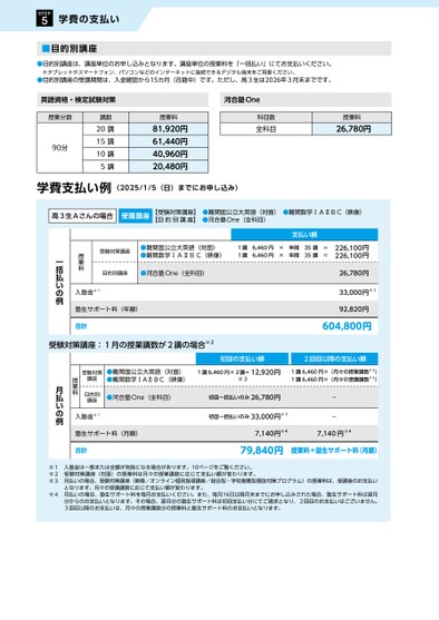 円円226,100226,10026,780円33,000円※192,820円604,800円5STEP学費の支払い■目的別講座●目的別講座は、講座単位のお申し込みとなります。講座単位の授業料を「一括払い」にてお支払いください。※タブレットやスマートフォン、パソコンなどのインターネットに接続できるデジタル端末をご用意ください。●目的別講座の受講期間は、入金確認から15カ月(在籍中)です。ただし、高3生は2026年3月末までです。英語資格・検定試験対策河合塾One授業分数90分講数20講15講10講5講授業料81,920円61,440円40,960円20,480円学費支払い例〈2025/1/5(日)までにお申し込み〉科目数全科目授業料26,780円高3生Aさんの場合受講講座【受験対策講座】●難関国公立大英語(対面)●難関数学ⅠAⅡBC(映像)【目的別講座】●河合塾One(全科目)受験対策講座●難関国公立大英語(対面)●難関数学ⅠAⅡBC(映像)1講6,460円×年間35講=1講6,460円×年間35講=支払い額目的別講座●河合塾One(全科目)授業料入塾金※1塾生サポート料(年額)合計一括払いの例入塾金※1塾生サポート料(月額)合計授業料月払いの例受験対策講座:1月の授業講数が2講の場合※2受験対策講座●難関国公立大英語(対面)●難関数学ⅠAⅡBC(映像)1講6,460円×2講=※312,920円1講6,460円×(月々の授業講数※2)1講6,460円×(月々の受講講数※3)初回の支払い額2回目以降の支払い額目的別講座●河合塾One(全科目)初回一括払いのみ26,780円初回一括払いのみ33,000円※1--7,140円※47,140円※479,840円授業料+塾生サポート料(月額)※1入塾金は一部または全額が免除になる場合があります。10ページをご覧ください。※2受験対策講座(対面)の授業料は月々の授業講数に応じて支払い額が変わります。※3月払いの場合、受験対策講座(映像/オンライン個別指導講座/総合型・学校推薦型選抜対策プログラム)の授業料は、受講後のお支払いとなります。月々の受講講数に応じて支払い額が変わります。※4月払いの場合、塾生サポート料を毎月お支払いください。また、毎月16日以降月末までにお申し込みされた場合、塾生サポート料は翌月分からのお支払いとなります。その場合、翌月分の塾生サポート料は初回支払い分にてご請求となり、2回目のお支払いはございません。3回目以降のお支払いは、月々の授業講数分の授業料と塾生サポート料のお支払いとなります。