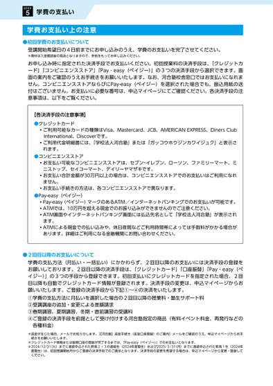 5STEP学費の支払い学費お支払い上の注意●初回学費のお支払いについて受講開始希望日の4日前までにお申し込みのうえ、学費のお支払いを完了させてください。※教材は入金確認後の発送となりますので、余裕をもってお申し込みください。お申し込み時に指定された決済手段でお支払いください。初回授業料の決済手段は、「クレジットカード」「コンビニエンスストア」「Pay‐easy(ペイジー)」の3つの決済手段から選択できます。画面の案内をご確認のうえお手続きをお願いいたします。なお、河合塾校舎窓口ではお支払いになれません。コンビニエンスストアならびにPay-easy(ペイジー)を選択された場合でも、振込用紙の送付はございません。お支払いに必要な番号は、申込マイページにてご確認ください。各決済手段の注意事項は、以下をご覧ください。【各決済手段の注意事項】●クレジットカードご利用可能なカードの種類はVisa、Mastercard、JCB、AMERICANEXPRESS、DinersClubInternational、Discoverです。ご利用代金明細書には、「学校法人河合塾」または「ガッコウホウジンカワイジュク」と表示されます。●コンビニエンスストアお支払い可能なコンビニエンスストアは、セブンーイレブン、ローソン、ファミリーマート、ミニストップ、セイコーマート、デイリーヤマザキです。お支払い合計金額が30万円以上の場合は、コンビニエンスストアでのお支払いはご利用になれません。お支払い手続きの方法は、各コンビニエンスストアで異なります。●Pay-easy(ペイジー)Pay-easy(ペイジー)マークのあるATM/インターネットバンキングでのお支払いが可能です。ATMでは、10万円を超える現金でのお振り込みができませんのでご注意ください。ATM画面やインターネットバンキング画面には払込先名として「学校法人河合塾」が表示されます。ATMによる現金での払い込みや、休日夜間などご利用時間帯によっては手数料がかかる場合があります。詳細はご利用になる金融機関にお問い合わせください。●2回目以降のお支払いについて学費の支払方法(月払い・一括払い)にかかわらず、2回目以降のお支払いには決済手段の登録をお願いしております。2回目以降の決済手段は、「クレジットカード」「口座振替」「Pay‐easy(ペイジー)」の3つの手段から登録できます。初回支払いにクレジットカードを指定された場合、2回目以降も自動でクレジットカード情報が登録されます。決済手段の変更は、申込マイページからお願いいたします。ご登録の決済手段から下記①〜④の決済をいたします。①学費の支払方法に月払いを選択した場合の2回目以降の授業料・塾生サポート料②受講講座の追加・変更による差額請求③春期講習、夏期講習、冬期・直前講習の受講料④ご登録の決済手段を前提として受け付けする河合塾指定の商品(有料イベント料金、再発行などの各種料金)※返金が生じた場合、メールでお知らせします。[【河合塾】返金手続き(返金口座登録)のご案内]メールをご確認のうえ、申込マイページからお手続きをお願いいたします。※クレジットカード情報または振替口座の登録が完了するまでは、「Pay-easy(ペイジー)」でのお支払いとなります。※2024/12/31(火)までに進級申込された新高2・3の進級生(2024年度塾生)および2025/3/31(月)までに進級申込された新高1生(2024年度塾生)は、初回受講開始月からご登録の決済手段でのご請求となります。決済手段の変更を希望する場合は、申込マイページから変更・登録してください。