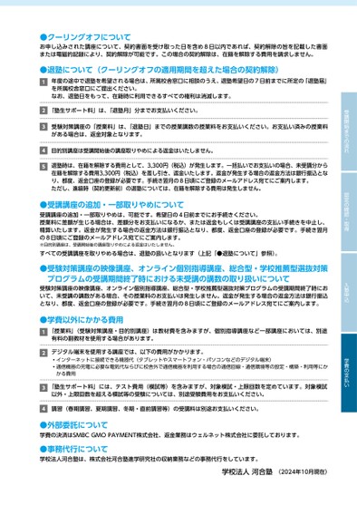 受講開始までの流れ認定の確認・取得入塾申込学費の支払い●クーリングオフについてお申し込みされた講座について、契約書面を受け取った日を含め8日以内であれば、契約解除の旨を記載した書面または電磁的記録により、契約解除が可能です。この場合の契約解除は、在籍を解除する費用を請求しません。●退塾について(クーリングオフの適用期間を超えた場合の契約解除)12345年度の途中で退塾を希望される場合は、所属校舎窓口に相談のうえ、退塾希望日の7日前までに所定の「退塾届」を所属校舎窓口にご提出ください。なお、退塾日をもって、在籍時に利用できるすべての権利は消滅します。「塾生サポート料」は、「退塾月」分までお支払いください。受験対策講座の「授業料」は、「退塾日」までの授業講数の授業料をお支払いください。お支払い済みの授業料がある場合は、返金対象となります。目的別講座は受講開始後の講座取りやめによる返金はいたしません。退塾時は、在籍を解除する費用として、3,300円(税込)が発生します。一括払いでお支払いの場合、未受講分から在籍を解除する費用3,300円(税込)を差し引き、返金いたします。返金が発生する場合の返金方法は銀行振込となり、都度、返金口座の登録が必要です。手続き翌月の8日頃にご登録のメールアドレス宛てにご案内します。ただし、進級時(契約更新前)の退塾については、在籍を解除する費用は発生しません。●受講講座の追加・一部取りやめについて受講講座の追加・一部取りやめは、可能です。希望日の4日前までにお手続きください。授業料に差額が生じる場合は、差額分をお支払いになるか、または返金もしくは受講講座の支払い手続きを中止し、精算いたします。返金が発生する場合の返金方法は銀行振込となり、都度、返金口座の登録が必要です。手続き翌月の8日頃にご登録のメールアドレス宛てにご案内します。※目的別講座は、受講開始後の講座取りやめによる返金はいたしません。すべての受講講座を取りやめる場合は、退塾の扱いとなります(上記「●退塾について」参照)。●受験対策講座の映像講座、オンライン個別指導講座、総合型・学校推薦型選抜対策プログラムの受講期間終了時における未受講の講数の取り扱いについて受験対策講座の映像講座、オンライン個別指導講座、総合型・学校推薦型選抜対策プログラムの受講期間終了時において、未受講の講数がある場合、その授業料のお支払いは発生しません。返金が発生する場合の返金方法は銀行振込となり、都度、返金口座の登録が必要です。手続き翌月の8日頃にご登録のメールアドレス宛てにご案内します。●学費以外にかかる費用1234「授業料」(受験対策講座・目的別講座)は教材費を含みますが、個別指導講座など一部講座においては、別途有料の副教材を使用する場合があります。デジタル端末を使用する講座では、以下の費用がかかります。インターネットに接続できる機器代(タブレットやスマートフォン・パソコンなどのデジタル端末)通信機器の充電に必要な電気代ならびに校舎外で通信機器を利用する場合の通信回線・通信環境等の設定・構築・利用等にかかる費用「塾生サポート料」には、テスト費用(模試等)を含みますが、対象模試・上限回数を定めています。対象模試以外・上限回数を超える模試等の受験については、別途受験費用をお支払いください。講習(春期講習、夏期講習、冬期・直前講習等)の受講料は別途お支払いください。●外部委託について学費の決済はSMBCGMOPAYMENT株式会社、返金業務はウェルネット株式会社に委託しております。●事務代行について学校法人河合塾は、株式会社河合塾進学研究社の収納業務などの事務代行をしています。学校法人河合塾(2024年10月現在)