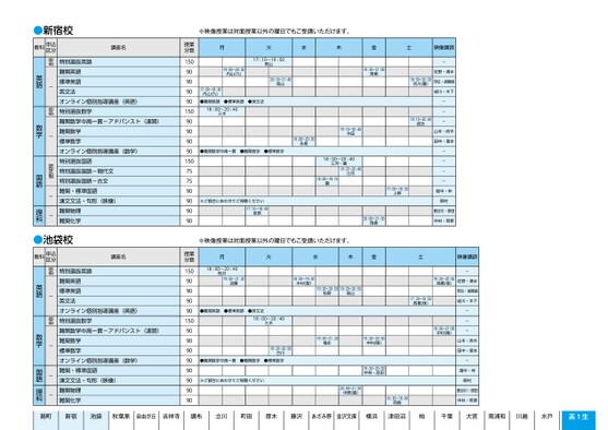 ※映像授業は対面授業以外の曜日でもご受講いただけます。月火水木金土映像講師19:00〜20:30内山(九)17:10〜19:50高山20:10〜21:40高山17:00〜18:30内山(九)●難関英語●標準英語●英文法18:00〜20:40三木●難関数学中高一貫●難関数学●標準数学19:10〜20:40今田19:00〜20:30永島18:00〜20:40三河・園19:25〜20:40三河18:00〜19:15園※ご都合にあわせてご視聴ください17:10〜18:40宮原19:30〜21:00青柳18:50〜20:20吉川(量)19:10〜20:40成合17:00〜18:30上野20:00〜21:30岡島※映像授業は対面授業以外の曜日でもご受講いただけます。月火水木金土18:00〜20:40桜井19:50〜21:20近藤18:00〜19:30木村(智)19:20〜20:50松野19:20〜20:50高山17:20〜18:50髙橋(保)●難関英語●標準英語●英文法18:00〜20:40三木●難関数学中高一貫●難関数学19:20〜20:50古川●標準数学※ご都合にあわせてご視聴ください19:50〜21:20福永19:20〜20:50中村(隆)19:20〜20:50中林・品田20:00〜21:30中野(喜)16:30〜18:00岡島-佐野・清水市位・胡摩﨑成川・木下---山本・府木田中・塚本----畑中・仲野村長谷川・原田中村・若原19:20〜20:50髙橋(保)19:30〜21:00中村(隆)映像講師-佐野・清水市位・胡摩﨑成川・木下---山本・府木田中・塚本-畑中・仲野村長谷川・原田中村・若原授業分数1509090909015090909090150757590909090授業分数150909090901509090909090909090特別選抜英語難関英語標準英語英文法オンライン個別指導講座(英語)特別選抜数学難関数学中高一貫-アドバンスト(速習)難関数学標準数学オンライン個別指導講座(数学)特別選抜国語特別選抜国語-現代文特別選抜国語-古文難関・標準国語漢文文法・句形(映像)難関物理難関化学認定制-認定制-認定制--英語数学国語理科池袋●池袋校特別選抜英語難関英語標準英語英文法オンライン個別指導講座(英語)特別選抜数学難関数学中高一貫-アドバンスト(速習)難関数学標準数学オンライン個別指導講座(数学)難関・標準国語漢文文法・句形(映像)難関物理難関化学認定制-認定制---英語数学国語理科教科申込区分講座名新宿●新宿校教科申込区分講座名麹町新宿池袋秋葉原自由が丘吉祥寺調布立川町田厚木藤沢あざみ野金沢文庫横浜津田沼柏千葉大宮南浦和川越水戸高1生1ページ●2025年度/51/東日本/新宿/高1生/パターン6617/2025_51_3_329_31_20240827150449.csv●2025年度/51東/池袋/高1生/パターン6617/2025_51校了時削除1ページ