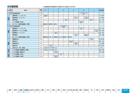 麹町新宿池袋秋葉原自由が丘吉祥寺調布立川町田厚木藤沢あざみ野金沢文庫横浜津田沼柏千葉大宮南浦和川越水戸高2生※映像授業は対面授業以外の曜日でもご受講いただけます。月火水木金土映像講師19:10〜20:40髙橋(保)●難関英語●標準英語●英文法19:10〜20:40成川19:00〜21:40伊東(鋼)19:00〜21:40田口20:00〜21:30村上20:10〜21:40土岐田17:20〜18:501:0濱崎17:20〜18:50渡辺19:50〜21:20遠藤19:50〜21:20古川19:20〜20:50高梨(大)●難関理系数学中高一貫●難関数学中高一貫●難関数学●標準数学17:30〜19:00阿部(誠)19:40〜21:10篠原17:20〜18:50隼坂※ご都合にあわせてご視聴ください※ご都合にあわせてご視聴ください19:00〜20:30大澤19:20〜20:50髙岡17:10〜18:40大内18:20〜19:50清川17:20〜18:50一瀬19:10〜20:40生田-村上・髙橋(保)村上・髙橋(保)成川・大島成川・木下--依田・合田依田・合田依田・合田河合・吉嗣-光田・清水(直)伊藤(さ)・菅井一路・斎藤田中・酒井(完)野村長谷川・原田中村・若原--授業分数15090909090901509090909090909090909090909090特別選抜英語難関英語-トップレベル難関英語-ハイレベル標準英語【4月開講】英文法オンライン個別指導講座(英語)特別選抜数学難関数学-トップレベル難関数学-ハイレベル理系難関数学-ハイレベル標準数学オンライン個別指導講座(数学)難関現代文難関古文標準現代文標準古文漢文文法・句形(映像)【4月開講】難関物理(映像)【4月開講】難関化学【4月開講】日本史【4月開講】世界史認定制-認定制----英語数学国語理科地歴秋葉原●秋葉原館教科申込区分講座名1ページ●2025年度/51/東日本/秋葉原/高2生/パターン6617/2025_51_3_368_32_20240827152336.csv校了時削除