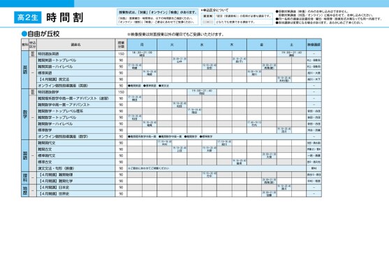授業形式は、「対面」「オンライン」「映像」があります。「対面」:授業曜日・時間帯は、以下の時間割をご確認ください。「オンライン(個別)」「映像」:ご都合にあわせてご受講ください。*申込区分について認定制「認定(受講資格)」の取得が必要な講座です。ーどなたでも受講できる講座です。●受験対策講座(映像)のみのお申し込みはできません。受験対策講座(対面/オンライン)と組み合わせて、お申し込みください。●同一名称の講座は設置校舎・曜日・時間帯・授業形式が異なっても同一内容です。●担当講師は変更になる場合があります。あらかじめご了承ください。※映像授業は対面授業以外の曜日でもご受講いただけます。月火水木金土映像講師18:20〜21:00横田17:10〜18:40明慶19:10〜20:40尾崎●難関英語●標準英語●英文法20:00〜21:30山中19:10〜20:40吉田20:10〜21:40森(千)20:00〜21:30髙橋(慶)18:00〜19:30清川19:00〜21:40瀬﨑19:10〜20:40木村(智)17:10〜18:40横田17:10〜18:40松田19:10〜20:40堀尾●難関理系数学中高一貫19:00〜21:40岡田19:10〜20:40松田17:10〜18:40岡田●難関数学中高一貫17:10〜18:40木村●難関数学●標準数学19:10〜20:40上田19:10〜20:40大野※ご都合にあわせてご視聴ください19:10〜20:40竹中17:40〜19:10竹内19:10〜20:40流川17:10〜18:40絵川20:00〜21:30大窪19:10〜20:40脇坂20:00〜21:30西尾(源)20:00〜21:30加藤19:10〜20:40黒川-村上・髙橋(保)村上・髙橋(保)成川・大島成川・木下----依田・合田依田・合田依田・合田河合・吉嗣-光田・清水(直)伊藤(さ)・菅井一路・斎藤田中・酒井(完)野村長谷川・原田中村・若原--授業分数150909090909015090909090909090909090909090909090講座名特別選抜英語難関英語-トップレベル難関英語-ハイレベル標準英語【4月開講】英文法オンライン個別指導講座(英語)特別選抜数学難関理系数学中高一貫-アドバンスト(速習)難関数学中高一貫-アドバンスト難関数学-トップレベル理系難関数学-トップレベル難関数学-ハイレベル標準数学オンライン個別指導講座(数学)難関現代文難関古文標準現代文標準古文漢文文法・句形(映像)【4月開講】難関物理【4月開講】難関化学【4月開講】日本史【4月開講】世界史教科申込区分認定制-認定制英語-数学---国語理科地歴高2生時間割自由が丘●自由が丘校1ページ●2025年度/51/東日本/自由が丘/高2生/パターン6617/2025_51_3_337_32_20240827152336.csv校了時削除