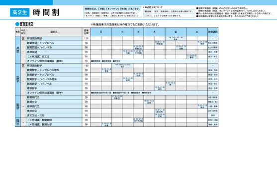 時間割授業形式は、「対面」「オンライン」「映像」があります。「対面」:授業曜日・時間帯は、以下の時間割をご確認ください。「オンライン(個別)」「映像」:ご都合にあわせてご受講ください。*申込区分について認定制「認定(受講資格)」の取得が必要な講座です。ーどなたでも受講できる講座です。●受験対策講座(映像)のみのお申し込みはできません。受験対策講座(対面/オンライン)と組み合わせて、お申し込みください。●同一名称の講座は設置校舎・曜日・時間帯・授業形式が異なっても同一内容です。●担当講師は変更になる場合があります。あらかじめご了承ください。高2生町田●町田校※映像授業は対面授業以外の曜日でもご受講いただけます。月火水木金土映像講師19:20〜20:50伊藤(宏)19:20〜20:50木村(麟)19:30〜21:00大島20:00〜21:30伊藤(直)18:50〜21:30高木20:00〜21:30近藤19:30〜21:00栗原17:30〜19:00栗原●難関英語●標準英語●英文法20:10〜21:40香坂18:50〜21:30生田19:20〜20:50竹内20:00〜21:30依田●難関理系数学中高一貫●難関数学中高一貫17:30〜19:00伊藤(武)●難関数学●標準数学18:00〜19:30吉澤18:00〜19:30隣19:30〜21:00窪田19:30〜21:00酒井(完)19:20〜20:50打越20:00〜21:30安達20:00〜21:30佐々木(哲)19:30〜21:00森永-村上・髙橋(保)村上・髙橋(保)成川・大島成川・木下--依田・合田依田・合田依田・合田依田・合田河合・吉嗣-光田・清水(直)伊藤(さ)・菅井一路・斎藤田中・酒井(完)野村長谷川・原田中村・若原授業分数150909090909015090909090909090909090909090特別選抜英語難関英語-トップレベル難関英語-ハイレベル標準英語【4月開講】英文法オンライン個別指導講座(英語)特別選抜数学難関数学-トップレベル理系難関数学-トップレベル難関数学-ハイレベル理系難関数学-ハイレベル標準数学オンライン個別指導講座(数学)難関現代文難関古文標準現代文標準古文漢文文法・句形【4月開講】難関物理【4月開講】難関化学認定制-認定制---英語数学国語理科教科申込区分講座名1ページ●2025年度/51/東日本/町田/高2生/パターン6617/2025_51_3_325_32_20240827152336.csv校了時削除