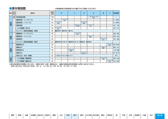 麹町新宿池袋秋葉原自由が丘吉祥寺調布立川町田厚木藤沢あざみ野金沢文庫横浜津田沼柏千葉大宮南浦和川越水戸高2生※映像授業は対面授業以外の曜日でもご受講いただけます。月火水木金土映像講師19:20〜20:50安井18:10〜19:40水野18:20〜19:50山口●難関英語●標準英語●英文法20:00〜21:30木村(麟)19:20〜20:50川口19:00〜21:40伊吹19:20〜20:50岡本19:30〜21:00大島19:30〜21:00富田●難関理系数学中高一貫●難関数学中高一貫●難関数学●標準数学18:00〜19:30飯田19:20〜20:50清水(め)※ご都合にあわせてご視聴ください-村上・髙橋(保)村上・髙橋(保)成川・大島成川・木下-依田・合田依田・合田河合・吉嗣-光田・清水(直)伊藤(さ)・菅井一路・斎藤田中・酒井(完)野村長谷川・原田中村・若原20:00〜21:30古谷19:30〜21:00越野19:10〜20:40絵川20:10〜21:40矢野19:10〜20:40早川授業分数15090909090909090909090909090909090講座名特別選抜英語難関英語-トップレベル難関英語-ハイレベル標準英語【4月開講】英文法オンライン個別指導講座(英語)難関数学-トップレベル難関数学-ハイレベル標準数学オンライン個別指導講座(数学)難関現代文難関古文標準現代文標準古文漢文文法・句形(映像)【4月開講】難関物理【4月開講】難関化学教科申込区分認定制-英語-数学--国語理科厚木●厚木現役館※厚木高校数学の設置もございます。授業の日程・内容・授業料など、講座の詳細は厚木現役館へお問い合わせください。お問い合わせ先:046-227-6581(月〜土14:00〜21:00/日・祝10:00〜17:00)1ページ●2025年度/51/東日本/厚木/高2生/パターン6617/2025_51_3_332_32_20240827200945.csv校了時削除