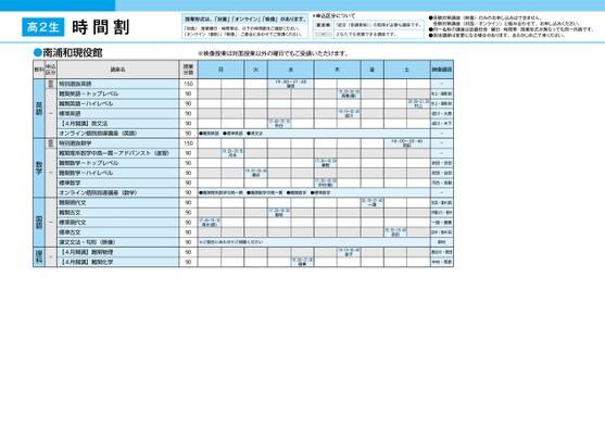 高2生時間割南浦和●南浦和現役館授業形式は、「対面」「オンライン」「映像」があります。「対面」:授業曜日・時間帯は、以下の時間割をご確認ください。「オンライン(個別)」「映像」:ご都合にあわせてご受講ください。*申込区分について認定制「認定(受講資格)」の取得が必要な講座です。ーどなたでも受講できる講座です。●受験対策講座(映像)のみのお申し込みはできません。受験対策講座(対面/オンライン)と組み合わせて、お申し込みください。●同一名称の講座は設置校舎・曜日・時間帯・授業形式が異なっても同一内容です。●担当講師は変更になる場合があります。あらかじめご了承ください。※映像授業は対面授業以外の曜日でもご受講いただけます。月火水木金土映像講師19:00〜21:40篠原●難関英語●標準英語●英文法17:40〜19:10秋谷19:20〜20:50河本19:10〜20:40瀬谷17:20〜18:50秦野17:20〜18:50中村(隆)19:20〜20:50髙橋(慶)19:10〜20:40成川20:00〜21:30村上18:00〜20:40岡田●難関理系数学中高一貫●難関数学中高一貫●難関数学●標準数学17:20〜18:50脇坂17:40〜19:10清水(直)※ご都合にあわせてご視聴ください20:10〜21:40一瀬18:10〜19:40品田19:10〜20:40金子19:30〜21:00國兼-村上・髙橋(保)村上・髙橋(保)成川・大島成川・木下---依田・合田依田・合田河合・吉嗣-光田・清水(直)伊藤(さ)・菅井一路・斎藤田中・酒井(完)野村長谷川・原田中村・若原授業分数1509090909090150909090909090909090909090特別選抜英語難関英語-トップレベル難関英語-ハイレベル標準英語【4月開講】英文法オンライン個別指導講座(英語)特別選抜数学難関理系数学中高一貫-アドバンスト(速習)難関数学-トップレベル難関数学-ハイレベル標準数学オンライン個別指導講座(数学)難関現代文難関古文標準現代文標準古文漢文文法・句形(映像)【4月開講】難関物理【4月開講】難関化学認定制-認定制---英語数学国語理科教科申込区分講座名1ページ●2025年度/51/東日本/南浦和/高2生/パターン6617/2025_51_3_336_32_20240827152336.csv校了時削除