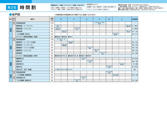 ※映像授業は対面授業以外の曜日でもご受講いただけます。月火水木金土17:30〜19:00岡本17:40〜19:10田村(修)19:30〜21:00山川19:30〜21:00田村(修)18:20〜21:00桜井19:30〜21:00::0池田(準)崎19:30〜21:00森(博)15:30〜17:00森(博)●難関英語●標準英語●英文法授業分数150909090909015018:20〜21:00合田90909090909090909090909090909019:30〜21:00伊東(鋼)17:30〜19:00佐藤(健)19:30〜21:00渡辺17:30〜19:00亀山19:30〜21:00亀山●難関理系数学中高一貫●難関数学中高一貫●難関数学●標準数学17:20〜18:50森下19:20〜20:50上田※ご都合にあわせてご視聴ください17:30〜19:00原19:20〜20:50白石17:40〜19:10喜久里19:20〜20:50小野19:10〜20:40小野16:30〜18:00佐々木(哲)映像講師-村上・髙橋(保)村上・髙橋(保)成川・大島成川・木下--依田・合田依田・合田依田・合田依田・合田河合・吉嗣-光田・清水(直)伊藤(さ)・菅井一路・斎藤田中・酒井(完)野村-長谷川・原田-中村・若原時間割授業形式は、「対面」「オンライン」「映像」があります。「対面」:授業曜日・時間帯は、以下の時間割をご確認ください。「オンライン(個別)」「映像」:ご都合にあわせてご受講ください。*申込区分について認定制「認定(受講資格)」の取得が必要な講座です。ーどなたでも受講できる講座です。●受験対策講座(映像)のみのお申し込みはできません。受験対策講座(対面/オンライン)と組み合わせて、お申し込みください。●同一名称の講座は設置校舎・曜日・時間帯・授業形式が異なっても同一内容です。●担当講師は変更になる場合があります。あらかじめご了承ください。特別選抜英語難関英語-トップレベル難関英語-ハイレベル標準英語【4月開講】英文法オンライン個別指導講座(英語)特別選抜数学難関数学-トップレベル理系難関数学-トップレベル難関数学-ハイレベル理系難関数学-ハイレベル標準数学オンライン個別指導講座(数学)難関現代文難関古文標準現代文標準古文漢文文法・句形(映像)特別選抜物理【4月開講】難関物理特別選抜化学【4月開講】難関化学認定制-認定制--認定制-認定制-英語数学国語理科教科申込区分講座名高2生水戸●水戸校1ページ●2025年度/51/東日本/水戸/高2生/パターン6617/2025_51_3_344_32_20240827152336.csv校了時削除