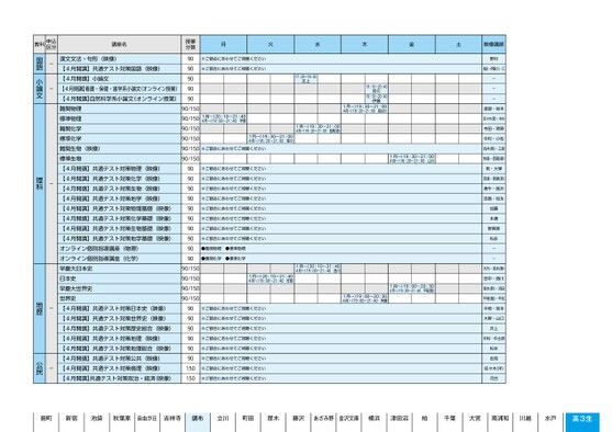 授業分数909090909090/15090/15090/15090/150月火水木金土※ご都合にあわせてご視聴ください※ご都合にあわせてご視聴ください17:20〜18:50正上1月〜)20:10〜21:404月〜)19:00〜21:40宇都1月〜)19:30〜21:004月〜)18:20〜21:00西尾(源)1月〜)19:30〜21:004月〜)18:20〜21:00菊川19:10〜20:4019:10〜20:40宮元伊藤1月〜)19:30〜21:004月〜)18:20〜21:00長谷川1月〜)19:30〜21:004月〜)18:20〜21:00山川90/150※ご都合にあわせてご視聴ください90/15090909090909090909090※ご都合にあわせてご視聴ください※ご都合にあわせてご視聴ください※ご都合にあわせてご視聴ください※ご都合にあわせてご視聴ください※ご都合にあわせてご視聴ください※ご都合にあわせてご視聴ください※ご都合にあわせてご視聴ください※ご都合にあわせてご視聴ください●難関物理●標準物理●難関化学●標準化学90/15090/15090/15090/1501月〜)20:10〜21:404月〜)19:00〜21:40西川1月〜)20:10〜21:404月〜)19:00〜21:40安部1月〜)19:00〜20:304月〜)19:00〜21:40平尾(雅)1月〜)19:00〜20:304月〜)19:00〜21:40斉藤909090909090150150※ご都合にあわせてご視聴ください※ご都合にあわせてご視聴ください※ご都合にあわせてご視聴ください※ご都合にあわせてご視聴ください※ご都合にあわせてご視聴ください※ご都合にあわせてご視聴ください※ご都合にあわせてご視聴ください※ご都合にあわせてご視聴ください映像講師野村福永・伊藤(さ)・江---渡部・坂本佐々木(哲)・木村寺田・青野中村・小松向井(亮)・三浦牧島・西尾(健)乾・大學安達・西尾(源)唐牛・長井田島・松永加藤本瀬野黒美松永--大内・坂本(勝)田中・西川坂本(新)・沼田平尾(雅)・平松中垣・宮本大野・山口井上中村・中土居松本吉見佐々木(洋)河合漢文文法・句形(映像)【4月開講】共通テスト対策国語(映像)【4月開講】小論文【4月開講】看護・保健・歯学系小論文(オンライン授業)【4月開講】自然科学系小論文(オンライン授業)難関物理標準物理難関化学標準化学難関生物(映像)標準生物【4月開講】共通テスト対策物理(映像)【4月開講】共通テスト対策化学(映像)【4月開講】共通テスト対策生物(映像)【4月開講】共通テスト対策地学(映像)【4月開講】共通テスト対策物理基礎(映像)【4月開講】共通テスト対策化学基礎(映像)【4月開講】共通テスト対策生物基礎(映像)【4月開講】共通テスト対策地学基礎(映像)オンライン個別指導講座(物理)オンライン個別指導講座(化学)早慶大日本史日本史早慶大世界史世界史【4月開講】共通テスト対策日本史(映像)【4月開講】共通テスト対策世界史(映像)【4月開講】共通テスト対策歴史総合(映像)【4月開講】共通テスト対策地理(映像)【4月開講】共通テスト対策地理総合(映像)【4月開講】共通テスト対策公共(映像)【4月開講】共通テスト対策倫理(映像)【4月開講】共通テスト対策政治・経済(映像)--国語小論文-理科-地歴-公民調布教科申込区分講座名2ページ●2025年度/51/東日本/調布/高3・卒生/パターン6617/2025_51_3_367_11_20240827173721.csv校了時削除麹町新宿池袋秋葉原自由が丘吉祥寺調布立川町田厚木藤沢あざみ野金沢文庫横浜津田沼柏千葉大宮南浦和川越水戸高3生