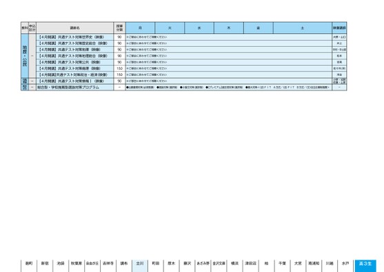 月火水木金土※ご都合にあわせてご視聴ください※ご都合にあわせてご視聴ください※ご都合にあわせてご視聴ください※ご都合にあわせてご視聴ください※ご都合にあわせてご視聴ください※ご都合にあわせてご視聴ください※ご都合にあわせてご視聴ください※ご都合にあわせてご視聴ください映像講師大野・山口井上中村・中土居松本吉見佐々木(洋)河合小野・加賀佐藤・山家●出願書類対策(必須受講)●面接対策(選択制)●小論文対策(選択制)●【プレミアム】過去問対策(選択制)●慶大対策<(法)FITA方式/(法)FITB方式/(文)自主応募制推薦>-授業分数909090909015015090-【4月開講】共通テスト対策世界史(映像)【4月開講】共通テスト対策歴史総合(映像)【4月開講】共通テスト対策地理(映像)【4月開講】共通テスト対策地理総合(映像)【4月開講】共通テスト対策公共(映像)【4月開講】共通テスト対策倫理(映像)【4月開講】共通テスト対策政治・経済(映像)【4月開講】共通テスト対策情報Ⅰ(映像)総合型・学校推薦型選抜対策プログラム---地歴・公民情報総合立川教科申込区分講座名5ページ●2025年度/51/東日本/立川/高3・卒生/パターン6617/2025_51_3_315_11_20240827173721.csv校了時削除麹町新宿池袋秋葉原自由が丘吉祥寺調布立川町田厚木藤沢あざみ野金沢文庫横浜津田沼柏千葉大宮南浦和川越水戸高3生