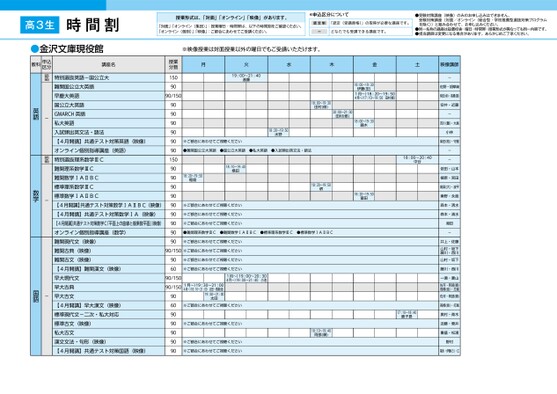 ※映像授業は対面授業以外の曜日でもご受講いただけます。月火水木金土映像講師19:00〜21:40遠藤18:00〜19:30田村(修)※ご都合にあわせてご視聴ください●難関国公立大英語●国公立大英語●私大英語●入試頻出英文法・語法18:20〜19:50水野18:00〜19:30伊藤(宏)1月〜)18:20〜19:504月〜)17:10〜19:50田村(修)20:00〜21:30田村(修)18:00〜19:30鏑木18:10〜19:40横田18:20〜19:50福島※ご都合にあわせてご視聴ください※ご都合にあわせてご視聴ください※ご都合にあわせてご視聴ください18:00〜20:40中谷18:20〜19:50堺18:20〜19:50富田●難関理系数学ⅢC●難関数学ⅠAⅡBC●標準理系数学ⅢC●標準数学ⅠAⅡBC※ご都合にあわせてご視聴ください90/150※ご都合にあわせてご視聴ください9060※ご都合にあわせてご視聴ください※ご都合にあわせてご視聴ください90/15090/150906090909090901月〜)19:00〜20:30小池4月〜)19:00〜21:401月〜)19:30〜21:00太田・髙橋(佳)4月〜)18:10〜21:0019:30〜21:00太田18:10〜19:10※ご都合にあわせてご視聴ください髙橋(佳)※ご都合にあわせてご視聴ください※ご都合にあわせてご視聴ください※ご都合にあわせてご視聴ください17:10〜18:40鹿子島18:10〜19:40阿部(順)-佐野・胡摩﨑柴田(卓)・髙橋(慶)安井・近藤-吉川(量)・大島小林柴田(祐)・守屋--依田・山本樋原・宮田高梨(大)・波平秦野・永島森本・清水森本・清水湘田-井上・佐藤山村・坂下藤川・西川山村・坂下藤川・西川一瀬・菱山佐河・阿部(順)髙橋(佳)・打越佐河・阿部(順)髙橋(佳)・打越奥村・青木近藤・菅井重盛・松浦野村福永・伊藤(さ)・江授業形式は、「対面」「オンライン」「映像」があります。「対面」「オンライン(集団)」:授業曜日・時間帯は、以下の時間割をご確認ください。「オンライン(個別)」「映像」:ご都合にあわせてご受講ください。*申込区分について認定制「認定(受講資格)」の取得が必要な講座です。ーどなたでも受講できる講座です。●受験対策講座(映像)のみのお申し込みはできません。受験対策講座(対面/オンライン〈総合型・学校推薦型選抜対策プログラムを除く〉)と組み合わせて、お申し込みください。●同一名称の講座は設置校舎・曜日・時間帯・授業形式が異なっても同一内容です。●担当講師は変更になる場合があります。あらかじめご了承ください。授業分数1509090/150909090909090150909090909090909090講座名特別選抜英語-国公立大難関国公立大英語早慶大英語国公立大英語GMARCH英語私大英語入試頻出英文法・語法【4月開講】共通テスト対策英語(映像)オンライン個別指導講座(英語)特別選抜理系数学ⅢC難関理系数学ⅢC難関数学ⅠAⅡBC標準理系数学ⅢC標準数学ⅠAⅡBC【4月開講】共通テスト対策数学ⅠAⅡBC(映像)【4月開講】共通テスト対策数学ⅠA(映像)【4月開講】共通テスト対策数学C「平面上の曲線と複素数平面」映像)オンライン個別指導講座(数学)難関現代文(映像)難関古典(映像)難関古文(映像)【4月開講】難関漢文(映像)早大現代文早大古典早大古文【4月開講】早大漢文標準現代文-二次・私大対応標準古文(映像)私大古文漢文文法・句形(映像)【4月開講】共通テスト対策国語(映像)(映像)認定制教科申込区分-英語認定制-数学-国語高3生時間割金沢文庫●金沢文庫現役館1ページ●2025年度/51/東日本/金沢文庫/高3・卒生/パターン6617/2025_51_3_335_11_20240827173721.csv校了時削除