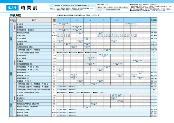 18:20〜21:00新野18:40〜21:20遠藤18:00〜20:4017:00〜19:40小森大胡20:00〜21:30押田90/1501月〜)19:00〜20:304月〜)19:00〜21:40香川17:20〜18:50池田1月〜)18:10〜19:404月〜)17:00〜19:40天倉17:20〜18:50海藤14:50〜17:30小山1月〜)18:10〜19:404月〜)17:00〜19:40仲野1月〜)15:50〜17:204月〜)14:40〜17:20柴田(卓)17:30〜19:00幸長17:20〜18:50清川19:20〜20:50清川17:30〜19:00鏑木20:00〜21:30大胡18:00〜19:3017:20〜18:50松本山口●難関国公立大英語●国公立大英語●私大英語●入試頻出英文法・語法19:20〜20:50池田17:30〜20:10渋谷17:30〜20:10須藤19:30〜21:00依田17:30〜19:00横田17:00〜19:40吉崎19:00〜21:40依田17:00〜18:30依田16:40〜19:20須藤19:50〜21:20國分16:40〜18:10板谷18:30〜20:00板谷18:30〜20:00瀬谷18:00〜19:30生田18:00〜19:3018:10〜19:40吉崎迫田20:00〜21:30迫田17:30〜19:00瀬谷20:00〜21:30吉崎※ご都合にあわせてご視聴ください※ご都合にあわせてご視聴ください●難関理系数学ⅢC●難関数学ⅠAⅡBC●標準理系数学ⅢC●標準数学ⅠAⅡBC※ご都合にあわせてご視聴ください19:50〜21:20小林17:50〜19:20佐河18:00〜21:20菊川・園・髙橋菊川・髙橋(佳)18:00〜19:30菊川19:50〜21:20園・髙橋(佳)園・髙90/150※ご都合にあわせてご視聴ください90※ご都合にあわせてご視聴ください---佐野・胡摩﨑柴田(卓)・髙橋(慶)安井・近藤-吉川(量)・大島小林柴田(祐)・守屋-------依田・山本樋原・宮田高梨(大)・波平秦野・永島森本・清水森本・清水湘田------井上・佐藤山村・坂下藤川・西川山村・坂下時間割授業形式は、「対面」「オンライン」「映像」があります。「対面」「オンライン(集団)」:授業曜日・時間帯は、以下の時間割をご確認ください。「オンライン(個別)」「映像」:ご都合にあわせてご受講ください。*申込区分について認定制「認定(受講資格)」の取得が必要な講座です。ーどなたでも受講できる講座です。●受験対策講座(映像)のみのお申し込みはできません。受験対策講座(対面/オンライン〈総合型・学校推薦型選抜対策プログラムを除く〉)と組み合わせて、お申し込みください。●同一名称の講座は設置校舎・曜日・時間帯・授業形式が異なっても同一内容です。●担当講師は変更になる場合があります。あらかじめご了承ください。※映像授業は対面授業以外の曜日でもご受講いただけます。月火水木金土映像講師授業分数15015015090909090909090150150150150909090909090909090901809090909090東大英語医進英語特別選抜英語-国公立大難関国公立大英語早慶大英語国公立大英語GMARCH英語私大英語入試頻出英文法・語法【4月開講】共通テスト対策英語オンライン個別指導講座(英語)東大理類数学東大文類数学医進数学特別選抜理系数学ⅢC特別選抜数学ⅠAⅡBC-理系特別選抜数学ⅠAⅡBC-文系難関理系数学ⅢC難関数学ⅠAⅡBC標準理系数学ⅢC標準数学ⅠAⅡBC【4月開講】共通テスト対策数学ⅠAⅡBC【4月開講】共通テスト対策数学ⅠA(映像)【4月開講】共通テスト対策数学C「平面上の曲線と複素数平面」映像)オンライン個別指導講座(数学)東大国語東大現代文東大古典難関国公立大現代文(論述対策)難関国公立大古文(論述対策)難関現代文(映像)難関古典(映像)難関古文(映像)認定制-認定制-認定制-英語数学国語教科申込区分講座名高3生横浜●横浜校1ページ●2025年度/51/東日本/横浜/高3・卒生/パターン6617/2025_51_3_321_11_20240827173721.csv校了時削除