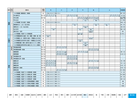 映像講師藤川・西川一瀬・菱山佐河・阿部(順)髙橋(佳)・打越佐河・阿部(順)髙橋(佳)・打越奥村・青木近藤・菅井重盛・松浦野村福永・伊藤(さ)・江-------渡部・坂本佐々木(哲)・木村--寺田・青野中村・小松向井(亮)・三浦向井(亮)・三浦牧島・西尾(健)乾・大學安達・西尾(源)唐牛・長井田島・松永加藤本瀬野黒美月火水木金土※ご都合にあわせてご視聴ください1月〜)18:10〜19:404月〜)17:00〜19:40一瀬1月〜)18:10〜19:404月〜)17:00〜19:40木村1月〜)18:00〜19:304月〜)18:00〜20:40菱山1月〜)19:10〜20:40村山・髙橋(佳)4月〜)17:50〜20:4019:10〜20:401月〜)19:30〜21:004月〜)18:10〜21:00隼坂・西川19:30〜21:00村山隼坂19:30〜21:00森永15:50〜17:20菱山※ご都合にあわせてご視聴ください19:20〜20:50大野17:20〜18:50田本20:00〜21:30木村17:50〜18:50髙橋(佳)17:20〜18:50村山17:30〜19:00飯田・税田17:20〜18:50山田18:10〜19:10西川17:30〜19:00隼坂17:30〜19:00髙橋(佳)17:30〜19:00清水(瑞)19:30〜21:00和田19:10〜20:4019:10〜20:40宮元伊藤1月〜)19:10〜20:404月〜)18:00〜20:40木村1月〜)20:10〜21:404月〜)19:00〜21:40中野(喜)1月〜)20:10〜21:404月〜)19:00〜21:40井上(順)1月〜)19:10〜20:404月〜)18:00〜20:40唐牛1月〜)19:10〜20:404月〜)18:00〜20:40小竹1月〜)19:10〜20:404月〜)18:00〜20:40浅利1月〜)20:10〜21:404月〜)19:00〜21:40安東1月〜)18:10〜19:404月〜)17:00〜19:40岡島1月〜)19:50〜21:204月〜)18:40〜21:20白石1月〜)20:10〜21:404月〜)19:00〜21:40長井1月〜)19:10〜20:40合田4月〜)18:00〜20:401月〜)18:20〜19:504月〜)17:10〜19:50佐々木(哲)1月〜)20:10〜21:404月〜)19:00〜21:40浅利1月〜)19:10〜20:404月〜)18:00〜20:40長井90909090909090※ご都合にあわせてご視聴ください※ご都合にあわせてご視聴ください※ご都合にあわせてご視聴ください※ご都合にあわせてご視聴ください※ご都合にあわせてご視聴ください※ご都合にあわせてご視聴ください※ご都合にあわせてご視聴ください授業分数6090/15090/15090609090909090909090909090/15090/15090/15090/15090/15090/15090/15090/15090/15090/15090/150(映像)【4月開講】難関漢文(映像)早大現代文早大古典早大古文【4月開講】早大漢文標準現代文-二次・私大対応標準古文-二次・私大対応私大古文漢文文法・句形【4月開講】共通テスト対策国語【4月開講】医系小論文-医・看護・保健・歯・薬【4月開講】人文・教育系小論文-早慶国公立大対応【4月開講】社会科学系小論文-早慶国公立大対応【4月開講】看護・保健・歯学系小論文(オンライン授業)【4月開講】自然科学系小論文(オンライン授業)特別選抜物理特別選抜物理-医進難関物理標準物理特別選抜化学特別選抜化学-医進難関化学標準化学難関生物難関生物-医進標準生物【4月開講】共通テスト対策物理(映像)【4月開講】共通テスト対策化学(映像)【4月開講】共通テスト対策生物(映像)【4月開講】共通テスト対策地学(映像)【4月開講】共通テスト対策物理基礎(映像)【4月開講】共通テスト対策化学基礎(映像)【4月開講】共通テスト対策生物基礎(映像)-国語-認定制-認定制-小論文理科横浜教科申込区分講座名3ページ●2025年度/51/東日本/横浜/高3・卒生/パターン6617/2025_51_3_321_11_20240827173721.csv校了時削除麹町新宿池袋秋葉原自由が丘吉祥寺調布立川町田厚木藤沢あざみ野金沢文庫横浜津田沼柏千葉大宮南浦和川越水戸高3生