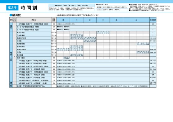 時間割授業形式は、「対面」「オンライン」「映像」があります。「対面」「オンライン(集団)」:授業曜日・時間帯は、以下の時間割をご確認ください。「オンライン(個別)」「映像」:ご都合にあわせてご受講ください。*申込区分について認定制「認定(受講資格)」の取得が必要な講座です。ーどなたでも受講できる講座です。●受験対策講座(映像)のみのお申し込みはできません。受験対策講座(対面/オンライン〈総合型・学校推薦型選抜対策プログラムを除く〉)と組み合わせて、お申し込みください。●同一名称の講座は設置校舎・曜日・時間帯・授業形式が異なっても同一内容です。●担当講師は変更になる場合があります。あらかじめご了承ください。高3生横浜●横浜校※映像授業は対面授業以外の曜日でもご受講いただけます。月火水木金土映像講師1月〜)19:40〜21:104月〜)18:30〜21:10田中1月〜)18:00〜19:304月〜)18:00〜20:40竹内1月〜)20:10〜21:404月〜)19:00〜21:40黒川※ご都合にあわせてご視聴ください●難関物理●標準物理●難関化学●標準化学1月〜)18:50〜20:204月〜)18:50〜21:30依田1月〜)19:10〜20:40坂本(勝)4月〜)18:00〜20:401月〜)18:20〜19:504月〜)17:10〜19:50大野1月〜)19:10〜20:404月〜)18:00〜20:40沼田1月〜)19:10〜20:404月〜)18:00〜20:40中井1月〜)19:10〜20:404月〜)18:00〜20:40加藤19:20〜20:50平尾(則)※ご都合にあわせてご視聴ください※ご都合にあわせてご視聴ください※ご都合にあわせてご視聴ください※ご都合にあわせてご視聴ください※ご都合にあわせてご視聴ください※ご都合にあわせてご視聴ください※ご都合にあわせてご視聴ください※ご都合にあわせてご視聴ください※ご都合にあわせてご視聴ください●出願書類対策(必須受講)●面接対策(選択制)●小論文対策(選択制)●【プレミアム】過去問対策(選択制)●慶大対策<(法)FITA方式/(法)FITgreencourse20251月〜)18:00〜19:304月〜)18:00〜20:40坂本(新)1月〜)18:50〜20:204月〜)17:40〜20:20斉藤松永----大内・坂本(勝)田中・西川--坂本(新)・沼田平尾(雅)・平松--中垣・宮本大野・山口井上中村・中土居松本吉見佐々木(洋)河合小野・加賀佐藤・山家B方式/(文)自主応募制推薦>-講座名【4月開講】共通テスト対策地学基礎(映像)オンライン個別指導講座(物理)オンライン個別指導講座(化学)東大日本史日本史論述早慶大日本史日本史東大世界史世界史論述早慶大世界史世界史東大地理政治・経済【4月開講】共通テスト対策日本史(映像)【4月開講】共通テスト対策世界史(映像)【4月開講】共通テスト対策歴史総合(映像)【4月開講】共通テスト対策地理(映像)【4月開講】共通テスト対策地理総合(映像)【4月開講】共通テスト対策公共(映像)【4月開講】共通テスト対策倫理(映像)【4月開講】共通テスト対策政治・経済(映像)【4月開講】共通テスト対策情報Ⅰ(映像)総合型・学校推薦型選抜対策プログラム授業分数90909090/15090/15090/15090/15090/15090/15090/15090/15090/1509090909090909015015090-教科申込区分-理科-地歴・公民--情報総合5ページ●2025年度/51/東日本/横浜/高3・卒生/パターン6617/2025_51_3_321_11_20240827173721.csv校了時削除