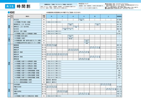 時間割授業形式は、「対面」「オンライン」「映像」があります。「対面」「オンライン(集団)」:授業曜日・時間帯は、以下の時間割をご確認ください。「オンライン(個別)」「映像」:ご都合にあわせてご受講ください。*申込区分について認定制「認定(受講資格)」の取得が必要な講座です。ーどなたでも受講できる講座です。※映像授業は対面授業以外の曜日でもご受講いただけます。●受験対策講座(映像)のみのお申し込みはできません。受験対策講座(対面/オンライン〈総合型・学校推薦型選抜対策プログラムを除く〉)と組み合わせて、お申し込みください。●同一名称の講座は設置校舎・曜日・時間帯・授業形式が異なっても同一内容です。●担当講師は変更になる場合があります。あらかじめご了承ください。月月火火水水※ご都合にあわせてご視聴ください木木18:00〜19:30隼坂隼坂18:00〜19:3019:50〜20:5019:50〜20:50宮本宮本18:00〜19:3018:00〜19:3020:00〜21:30川崎川崎松藤松藤中中19:20〜20:5018:00〜19:3020:00〜21:3019:20〜20:5018:00〜19:30今西今西金金土土20:10〜21:4020:10〜21:40荒田荒田1月〜)20:10〜21:404月〜)19:00〜21:40加藤1月〜)20:10〜21:404月〜)19:00〜21:40加藤1月〜)20:10〜21:404月〜)19:00〜21:40三浦1月〜)20:10〜21:404月〜)19:00〜21:40三浦17:20〜18:50清水(唯)宮元17:20〜18:50清水(唯)19:10〜20:4019:10〜20:4019:10〜20:40宮元伊藤伊藤1月〜)19:10〜20:404月〜)18:00〜20:40沖1月〜)19:10〜20:404月〜)18:00〜20:40沖1月〜)19:10〜20:404月〜)18:00〜20:40清野1月〜)19:10〜20:404月〜)18:00〜20:40清野1月〜)20:10〜21:404月〜)19:00〜21:40倉田1月〜)20:10〜21:404月〜)19:00〜21:40倉田1月〜)19:10〜20:404月〜)18:00〜20:40舩倉1月〜)19:10〜20:404月〜)18:00〜20:40舩倉1月〜)20:10〜21:404月〜)19:00〜21:40髙橋1月〜)20:10〜21:404月〜)19:00〜21:40髙橋1月〜)20:10〜21:404月〜)19:00〜21:40小嶋1月〜)20:10〜21:404月〜)19:00〜21:40小嶋映像講師映像講師佐河・阿部(順)髙橋(佳)・打越阿部(順)奥村・青木橋(佳)・打越近藤・菅井重盛・松浦重盛・松浦野村福永・伊藤(さ)・江野村福永・伊藤(さ)・江---渡部・坂本佐々木(哲)・木村部本寺田・青野佐々木(哲)・木村寺田・青野中村・小松向井(亮)・三浦村・小松牧島・西尾(健)亮)・三浦牧島・西尾(健)乾大學安達・西尾(源)乾大學唐牛・長井達・西(源)田島・松永田島・松永加藤本瀬野黒美本瀬野黒美松永松永----大内・坂本(勝)-田中・西川内・坂(勝)坂本(新)・沼田中・西川平尾(雅)・平松中垣・宮本尾(雅)・平松中垣・宮本※ご都合にあわせてご視聴ください※ご都合にあわせてご視聴ください※ご都合にあわせてご視聴ください1月〜)20:10〜21:404月〜)19:00〜21:40中野(喜)1月〜)20:10〜21:404月〜)19:00〜21:40中野(喜)1月〜)19:10〜20:404月〜)18:00〜20:40清野1月〜)19:10〜20:404月〜)18:00〜20:40清野1月〜)20:10〜21:404月〜)19:00〜21:40原1月〜)20:10〜21:404月〜)19:00〜21:40原※ご都合にあわせてご視聴ください※ご都合にあわせてご視聴ください※ご都合にあわせてご視聴ください※ご都合にあわせてご視聴ください※ご都合にあわせてご視聴ください※ご都合にあわせてご視聴ください※ご都合にあわせてご視聴ください※ご都合にあわせてご視聴ください●難関物理あわせてご視聴ください●難関化学●標準化学●難関化学●標準化学1月〜)18:20〜19:504月〜)17:10〜19:50大内1月〜)18:20〜19:504月〜)17:10〜19:50大内1月〜)20:10〜21:404月〜)19:00〜21:40坂本(新)1月〜)20:10〜21:404月〜)19:00〜21:40坂本(新)※ご都合にあわせてご視聴ください※ご都合にあわせてご視聴ください講座名講座名(映像)早大古文【4月開講】早大漢文標準現代文-二次・私大対応標準古文-二次・私大対応応私大古文-二次・私大対応漢文文法・句形(映像)【4月開講】共通テスト対策国語(映像)【4月開講】小論文【4月開講】共通テスト対策国語(映像)【4月開講】看護・保健・歯学系小論文(オンライン授業)4月開講】小論【4月開講】自然科学系小論文(オンライン授業)4月開講】看・保健・歯学小論(オイン授業)難関物理講】自然科学系小論文(オンライン授業)標準物理難関化学難関化学-医進標準化学-医進難関生物-医進標準生物-医進【4月開講】共通テスト対策物理(映像)【4月開講】共通テスト対策化学(映像)【4月開講】共通テスト対策生物(映像)【4月開講】共通テスト対策地学(映像)【4月開講】共通テスト対策物理基礎(映像)【4月開講】共通テスト対策化学基礎(映像)【4月開講】共通テスト対策物理基礎(映像)【4月開講】共通テスト対策生物基礎(映像)【4月開講】共通テスト対策地学基礎(映像)オンライン個別指導講座(物理)基礎(映像)オンライン個別指導講座(化学)日本史論述個別指導講座(化学)早慶大日本史日本史日本史早慶大世界史世界史世界史【4月開講】共通テスト対策日本史(映像)【4月開講】共通テスト対策日本史(映像)授業分数授業分数9060909090909090909090/150090/15090/15090/15090/15090/15090/15090/15090/150090909090909090909090/150090/15090/15090/15090/15090/15090/150090--国語国語---小論文小論文小論文--理科理科--地歴地歴●柏校科申込区分科申込区分柏教柏教高3生3ページ3ページ●2025年度/51/東日本/柏/高3・卒
