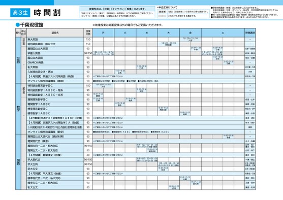 時間割授業形式は、「対面」「オンライン」「映像」があります。「対面」「オンライン(集団)」:授業曜日・時間帯は、以下の時間割をご確認ください。「オンライン(個別)」「映像」:ご都合にあわせてご受講ください。*申込区分について認定制「認定(受講資格)」の取得が必要な講座です。ーどなたでも受講できる講座です。●受験対策講座(映像)のみのお申し込みはできません。受験対策講座(対面/オンライン〈総合型・学校推薦型選抜対策プログラムを除く〉)と組み合わせて、お申し込みください。●同一名称の講座は設置校舎・曜日・時間帯・授業形式が異なっても同一内容です。●担当講師は変更になる場合があります。あらかじめご了承ください。※映像授業は対面授業以外の曜日でもご受講いただけます。月火水木金土90/1501月〜)18:20〜19:504月〜)17:10〜19:50石橋18:20〜21:00田村(喜)18:30〜21:10久野20:00〜21:30平林18:00〜19:30石橋1月〜)17:10〜18:404月〜)16:00〜18:40田村(喜)17:20〜18:50平林17:10〜18:40日髙※ご都合にあわせてご視聴ください17:20〜18:50日髙●難関国公立大英語19:00〜21:40天野18:00〜19:3017:10〜18:40飯島天野●国公立大英語●私大英語●入試頻出英文法・語法18:00〜19:30天野20:10〜21:40福永18:10〜19:40福永18:00〜19:30高梨(由)18:00〜19:30島田※ご都合にあわせてご視聴ください※ご都合にあわせてご視聴ください※ご都合にあわせてご視聴ください●難関理系数学ⅢC●難関数学ⅠAⅡBC●標準理系数学ⅢC●標準数学ⅠAⅡBC※ご都合にあわせてご視聴ください※ご都合にあわせてご視聴ください※ご都合にあわせてご視聴ください1月〜)20:00〜21:30阿部(誠)・高橋(健)4月〜)18:40〜21:3020:00〜21:30阿部(誠)18:40〜19:40高橋(健)1月〜)19:30〜21:00兵頭4月〜)18:20〜21:001月〜)18:00〜19:304月〜)18:00〜20:50佐河・桑島月〜):00〜0:佐河・高橋(健)18:00〜19:30佐河19:50〜20:50桑島20:00〜21:30佐河18:00〜19:30山崎19:50〜21:20西大路20:00〜21:30石橋19:00〜20:30手塚映像講師--佐野・胡摩﨑柴田(卓)・髙橋(慶)安井・近藤-吉川(量)・大島小林柴田(祐)・守屋----依田・山本樋原・宮田高梨(大)・波平秦野・永島森本・清水森本・清水湘田--井上・佐藤山村・坂下藤川・西川山村・坂下藤川・西川一瀬・菱山佐河・阿部(順)髙橋(佳)・打越佐河・阿部(順)髙橋(佳)・打越奥村・青木近藤・菅井重盛・松浦授業分数1501509090909090909015090909090909090909090909090/150906090/15090/1509060909090東大英語特別選抜英語-国公立大難関国公立大英語早慶大英語国公立大英語GMARCH英語私大英語入試頻出英文法・語法【4月開講】共通テスト対策英語(映像)オンライン個別指導講座(英語)特別選抜理系数学ⅢC特別選抜数学ⅠAⅡBC-理系特別選抜数学ⅠAⅡBC-文系難関理系数学ⅢC難関数学ⅠAⅡBC標準理系数学ⅢC標準数学ⅠAⅡBC【4月開講】共通テスト対策数学ⅠAⅡBC(映像)【4月開講】共通テスト対策数学ⅠA(映像)【4月開講】共通テスト対策数学C「平面上の曲線と複素数平面」映像)オンライン個別指導講座(数学)難関国公立大現代文(論述対策)難関現代文(映像)難関古典-二次・私大対応難関古文-二次・私大対応【4月開講】難関漢文-二次・私大対応早大現代文早大古典早大古文【4月開講】早大漢文標準現代文-二次・私大対応標準古文-二次・私大対応私大古文(映像)認定制-認定制-英語数学-国語教科申込区分講座名高3生千葉●千葉現役館1ページ●2025年度/51/東日本/千葉/高3・卒生/パターン6617/2025_51_3_334_11_20240827173721.csv校了時削除