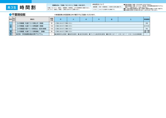 時間割授業形式は、「対面」「オンライン」「映像」があります。「対面」「オンライン(集団)」:授業曜日・時間帯は、以下の時間割をご確認ください。「オンライン(個別)」「映像」:ご都合にあわせてご受講ください。*申込区分について認定制「認定(受講資格)」の取得が必要な講座です。ーどなたでも受講できる講座です。●受験対策講座(映像)のみのお申し込みはできません。受験対策講座(対面/オンライン〈総合型・学校推薦型選抜対策プログラムを除く〉)と組み合わせて、お申し込みください。●同一名称の講座は設置校舎・曜日・時間帯・授業形式が異なっても同一内容です。●担当講師は変更になる場合があります。あらかじめご了承ください。※映像授業は対面授業以外の曜日でもご受講いただけます。月火水木金土※ご都合にあわせてご視聴ください※ご都合にあわせてご視聴ください※ご都合にあわせてご視聴ください※ご都合にあわせてご視聴ください映像講師吉見佐々木(洋)河合小野・加賀佐藤・山家●出願書類対策(必須受講)●面接対策(選択制)●小論文対策(選択制)●【プレミアム】過去問対策(選択制)●慶大対策<(法)FITA方式/(法)FITB方式/(文)自主応募制推薦>-greencourse2025授業分数9015015090-講座名【4月開講】共通テスト対策公共(映像)【4月開講】共通テスト対策倫理(映像)【4月開講】共通テスト対策政治・経済(映像)【4月開講】共通テスト対策情報Ⅰ(映像)総合型・学校推薦型選抜対策プログラム教科申込区分---公民情報総合高3生千葉●千葉現役館4ページ●2025年度/51/東日本/千葉/高3・卒生/パターン6617/2025_51_3_334_11_20240827173721.csv校了時削除