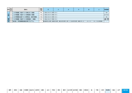 月火水木金土※ご都合にあわせてご視聴ください※ご都合にあわせてご視聴ください※ご都合にあわせてご視聴ください※ご都合にあわせてご視聴ください映像講師吉見佐々木(洋)河合小野・加賀佐藤・山家●出願書類対策(必須受講)●面接対策(選択制)●小論文対策(選択制)●【プレミアム】過去問対策(選択制)●慶大対策<(法)FITA方式/(法)FITB方式/(文)自主応募制推薦>-授業分数9015015090-講座名【4月開講】共通テスト対策公共(映像)【4月開講】共通テスト対策倫理(映像)【4月開講】共通テスト対策政治・経済(映像)【4月開講】共通テスト対策情報Ⅰ(映像)総合型・学校推薦型選抜対策プログラム教科申込区分---公民情報総合南浦和4ページ●2025年度/51/東日本/南浦和/高3・卒生/パターン6617/2025_51_3_336_11_20240828100442.csv校了時削除麹町新宿池袋秋葉原自由が丘吉祥寺調布立川町田厚木藤沢あざみ野金沢文庫横浜津田沼柏千葉大宮南浦和川越水戸高3生