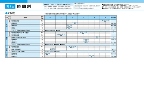 時間割授業形式は、「対面」「オンライン」「映像」があります。「対面」:授業曜日・時間帯は、以下の時間割をご確認ください。「オンライン(個別)」「映像」:ご都合にあわせてご受講ください。*申込区分について認定制「認定(受講資格)」の取得が必要な講座です。ーどなたでも受講できる講座です。●受験対策講座(映像)のみのお申し込みはできません。受験対策講座(対面/オンライン)と組み合わせて、お申し込みください。●同一名称の講座は設置校舎・曜日・時間帯・授業形式が異なっても同一内容です。●担当講師は変更になる場合があります。あらかじめご了承ください。高1生大阪●大阪校教科申込区分1ページ●2025年度/51/近畿/大阪/高1生/パターン6617/2025_51_5_511_31_20240815153005.csv校了時削除※映像授業は対面授業以外の曜日でもご受講いただけます。月火水木金土映像講師19:50〜21:20清水18:40〜21:20国松●難関英語●標準英語●英文法18:00〜19:3018:00〜19:30清水香川18:40〜21:2018:40~21:20寺尾寺尾18:40~21:2018:40〜21:20藤野藤野19:50〜21:20河村19:50〜21:20山本(洋)●難関数学中高一貫●難関数学●標準数学19:50〜21:20野口(た)・仲※ご都合にあわせてご視聴ください18:00〜19:30植田18:20〜21:00畑中・阪上19:50〜21:20木村18:00〜19:30西-佐野・清水市位・胡摩﨑成川・木下----山本(洋)・府木田中・塚本--畑中・仲野村長谷川・原田中村・若原授業分数150909090901501509090909015090909090講座名特別選抜英語難関英語標準英語英文法オンライン個別指導講座(英語)特別選抜数学中高一貫(速習)特別選抜数学中高一貫(速習)難関数学中高一貫(速習)難関数学標準数学オンライン個別指導講座(数学)特別選抜国語難関・標準国語漢文文法・句形(映像)難関物理難関化学認定制-認定制-認定制--英語数学国語理科