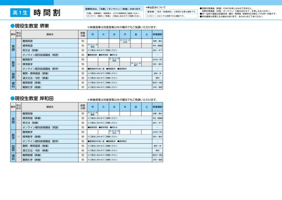 高1生時間割授業形式は、「対面」「オンライン」「映像」があります。「対面」:授業曜日・時間帯は、以下の時間割をご確認ください。「オンライン(個別)」「映像」:ご都合にあわせてご受講ください。*申込区分について認定制「認定(受講資格)」の取得が必要な講座です。ーどなたでも受講できる講座です。●受験対策講座(映像)のみのお申し込みはできません。受験対策講座(対面/オンライン)と組み合わせて、お申し込みください。●同一名称の講座は設置校舎・曜日・時間帯・授業形式が異なっても同一内容です。●担当講師は変更になる場合があります。あらかじめご了承ください。講座名難関英語標準英語英文法(映像)オンライン個別指導講座(英語)難関数学標準数学オンライン個別指導講座(数学)難関・標準国語(映像)漢文文法・句形(映像)難関物理(映像)難関化学(映像)教科申込区分----英語数学国語理科講座名難関英語標準英語(映像)英文法(映像)オンライン個別指導講座(英語)難関数学標準数学(映像)オンライン個別指導講座(数学)難関・標準国語(映像)漢文文法・句形(映像)難関物理(映像)難関化学(映像)教科申込区分----英語数学国語理科岸和田●現役生教室岸和田堺東●現役生教室堺東※映像授業は対面授業以外の曜日でもご受講いただけます。月火水木金土映像講師20:10〜21:40山内20:10〜21:40西田※ご都合にあわせてご視聴ください●難関英語●標準英語●英文法20:10〜21:40池田●難関数学中高一貫●難関数学●標準数学※ご都合にあわせてご視聴ください※ご都合にあわせてご視聴ください※ご都合にあわせてご視聴ください※ご都合にあわせてご視聴ください20:10〜21:40髙戸佐野・清水市位・胡摩﨑成川・木下-山本(洋)・府木田中・塚本-畑中・仲野村長谷川・原田中村・若原※映像授業は対面授業以外の曜日でもご受講いただけます。月火水木金土映像講師20:10〜21:40藤森※ご都合にあわせてご視聴ください※ご都合にあわせてご視聴ください●難関英語●標準英語●英文法20:10〜21:40中川※ご都合にあわせてご視聴ください●難関数学中高一貫●難関数学●標準数学※ご都合にあわせてご視聴ください※ご都合にあわせてご視聴ください※ご都合にあわせてご視聴ください※ご都合にあわせてご視聴ください佐野・清水市位・胡摩﨑成川・木下-山本(洋)・府木田中・塚本-畑中・仲野村長谷川・原田中村・若原授業分数9090909090909090909090授業分数90909090909090909090901ページ●2025年度/51/近畿/堺東/高1生/パターン6617/2025_51_5_533_31_20240815153005.csv●205年度/1/近畿/岸和田/高1生/パターン6617/2025_51_5_564_3校了時削除1ページ