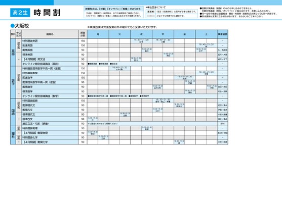 時間割授業形式は、「対面」「オンライン」「映像」があります。「対面」:授業曜日・時間帯は、以下の時間割をご確認ください。「オンライン(個別)」「映像」:ご都合にあわせてご受講ください。*申込区分について認定制「認定(受講資格)」の取得が必要な講座です。ーどなたでも受講できる講座です。●受験対策講座(映像)のみのお申し込みはできません。受験対策講座(対面/オンライン)と組み合わせて、お申し込みください。●同一名称の講座は設置校舎・曜日・時間帯・授業形式が異なっても同一内容です。●担当講師は変更になる場合があります。あらかじめご了承ください。※映像授業は対面授業以外の曜日でもご受講いただけます。月火水木金土映像講師18:40〜21:20江本18:40〜21:20刀19:50〜21:20香川18:00〜19:30香川19:50〜21:20原田●難関英語●標準英語●英文法18:40〜21:20山本(敏)18:40〜21:20西浦19:50〜21:20伊藤19:50〜21:20瀬古●難関理系数学中高一貫●難関数学中高一貫●難関数学●標準数学19:50〜21:20北野18:00〜19:30仲※ご都合にあわせてご視聴ください18:00〜19:30植田19:50〜21:20古川19:50〜21:20瀧澤18:00〜19:30山本(洋)18:20〜21:00畑中・阪上・幸重18:00〜19:30山口18:00〜19:30佐佐木18:00〜19:30西18:40〜21:20慎18:00〜19:30木下18:40〜21:20寺尾--村上・髙橋(保)成川・大島成川・木下-----19:50〜21:20中田依田・合田河合・吉嗣--光田・清水伊藤・菅井一路・斎藤田中・酒井野村-長谷川・原田-中村・若原授業分数1501509090909015015015090909090150909090909090909090講座名特別選抜英語医進英語難関英語標準英語【4月開講】英文法オンライン個別指導講座(英語)特別選抜理系数学中高一貫(速習)特別選抜数学医進数学難関理系数学中高一貫(速習)難関数学標準数学オンライン個別指導講座(数学)特別選抜国語難関現代文難関古文標準現代文標準古文漢文文法・句形(映像)特別選抜物理【4月開講】難関物理特別選抜化学【4月開講】難関化学認定制-認定制-認定制-認定制-認定制-英語数学国語理科高2生大阪●大阪校教科申込区分1ページ●2025年度/51/近畿/大阪/高2生/パターン6617/2025_51_5_511_32_20240815170717.csv校了時削除