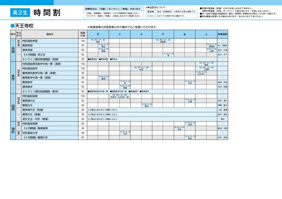 授業形式は、「対面」「オンライン」「映像」があります。「対面」:授業曜日・時間帯は、以下の時間割をご確認ください。「オンライン(個別)」「映像」:ご都合にあわせてご受講ください。*申込区分について認定制「認定(受講資格)」の取得が必要な講座です。ーどなたでも受講できる講座です。●受験対策講座(映像)のみのお申し込みはできません。受験対策講座(対面/オンライン)と組み合わせて、お申し込みください。●同一名称の講座は設置校舎・曜日・時間帯・授業形式が異なっても同一内容です。●担当講師は変更になる場合があります。あらかじめご了承ください。※映像授業は対面授業以外の曜日でもご受講いただけます。月火水木金土映像講師18:40〜21:20原田19:50〜21:2019:50〜21:20国松津留●難関英語●標準英語●英文法18:40〜21:20中田19:50〜21:20権田●難関理系数学中高一貫19:50〜21:20岸19:50〜21:20信岡●難関数学中高一貫18:20〜21:00佐佐木・山本(ま)・畑●難関数学●標準数学19:50〜21:20菅井※ご都合にあわせてご視聴ください※ご都合にあわせてご視聴ください※ご都合にあわせてご視聴ください19:50〜21:20小松18:40〜21:20胡摩﨑19:50〜21:20村慎19:50〜21:20北村19:50〜21:20江濵18:00〜19:30辻居19:50〜21:20吉田19:50〜21:20岡内19:50〜21:20胡摩﨑19:50〜21:20山崎18:40〜21:20湘田18:40〜21:20上高原18:00〜19:30山本(洋)-村上・髙橋(保)成川・大島成川・木下-----依田・合田河合・吉嗣--光田・清水伊藤・菅井一路・斎藤田中・酒井野村-長谷川・原田-中村・若原授業分数150909090901501509090909090150909090909090909090特別選抜英語難関英語標準英語【4月開講】英文法オンライン個別指導講座(英語)特別選抜理系数学中高一貫(速習)特別選抜数学難関理系数学中高一貫(速習)難関数学中高一貫(速習)難関数学標準数学オンライン個別指導講座(数学)特別選抜国語難関現代文難関古文標準現代文(映像)標準古文(映像)漢文文法・句形(映像)特別選抜物理【4月開講】難関物理特別選抜化学【4月開講】難関化学認定制-認定制-認定制-認定制-認定制-英語数学国語理科教科申込区分講座名時間割高2生天王寺●天王寺校1ページ●2025年度/51/近畿/天王寺/高2生/パターン6617/2025_51_5_515_32_20240815170717.csv校了時削除