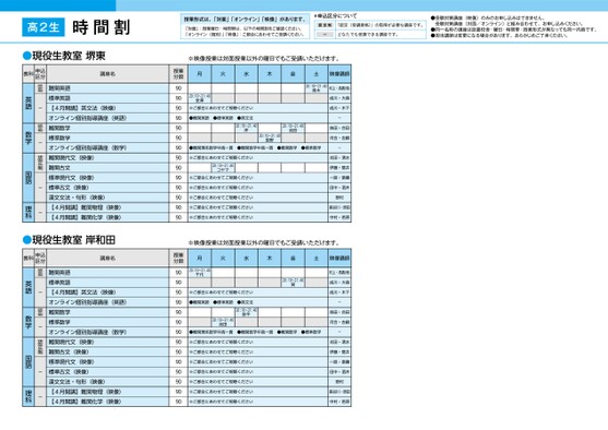 高2生時間割授業形式は、「対面」「オンライン」「映像」があります。「対面」:授業曜日・時間帯は、以下の時間割をご確認ください。「オンライン(個別)」「映像」:ご都合にあわせてご受講ください。*申込区分について認定制「認定(受講資格)」の取得が必要な講座です。ーどなたでも受講できる講座です。●受験対策講座(映像)のみのお申し込みはできません。受験対策講座(対面/オンライン)と組み合わせて、お申し込みください。●同一名称の講座は設置校舎・曜日・時間帯・授業形式が異なっても同一内容です。●担当講師は変更になる場合があります。あらかじめご了承ください。難関英語標準英語【4月開講】英文法(映像)オンライン個別指導講座(英語)難関数学標準数学オンライン個別指導講座(数学)難関現代文(映像)難関古文標準現代文(映像)標準古文(映像)漢文文法・句形(映像)【4月開講】難関物理(映像)【4月開講】難関化学(映像)認定制-認定制-認定制--英語数学国語理科教科申込区分講座名岸和田●現役生教室岸和田教科申込区分講座名難関英語標準英語【4月開講】英文法(映像)オンライン個別指導講座(英語)難関数学標準数学オンライン個別指導講座(数学)難関現代文(映像)難関古文(映像)標準現代文(映像)標準古文(映像)漢文文法・句形(映像)【4月開講】難関物理(映像)【4月開講】難関化学(映像)認定制-認定制-認定制--英語数学国語理科堺東●現役生教室堺東※映像授業は対面授業以外の曜日でもご受講いただけます。月火水木金土20:10〜21:40金澤いさだく聴視ごてせわあに合都ご※語英関難●語英準標●法文英●20:10〜21:40岸20:10〜21:40池田20:10〜21:40数野20:10〜21:40青木映像講師村上・髙橋(保)成川・大島下木・川成-依田・合田河合・吉嗣●難関理系数学中高一貫●難関数学中高一貫●難関数学●標準数学-いさだく聴視ごてせわあに合都ご※20:10〜21:40コヤマいさだく聴視ごてせわあに合都ご※いさだく聴視ごてせわあに合都ご※いさだく聴視ごてせわあに合都ご※※ご都合にあわせてご視聴くださいいさだく聴視ごてせわあに合都ご※水清・田光伊藤・菅井藤斎・路一井酒・中田村野長谷川・原田原若・村中※映像授業は対面授業以外の曜日でもご受講いただけます。月火水木金土映像講師20:10〜21:40千代※ご都合にあわせてご視聴ください●難関英語●標準英語20:10〜21:40池田●英文法20:10〜21:40影平20:10〜21:40巽村上・髙橋(保)成川・大島成川・木下-依田・合田河合・吉嗣●難関理系数学中高一貫●難関数学中高一貫●難関数学●標準数学-※ご都合にあわせてご視聴ください※ご都合にあわせてご視聴ください※ご都合にあわせてご視聴ください※ご都合にあわせてご視聴ください※ご都合にあわせてご視聴ください※ご都合にあわせてご視聴ください※ご都合にあわせてご視聴ください光田・清水伊藤・菅井一路・斎藤田中・酒井野村長谷川・原田中村・若原授業分数9090909090909090909090909090授業分数90909090909090909090909090901ページ●2025年度/51/近畿/堺東/高2生/パターン6617/2025_51_5_533_32_20240815170717.csv●202年度/51/近畿/岸和田/高2生/パターン6617/2025_51校了時削除1ージ