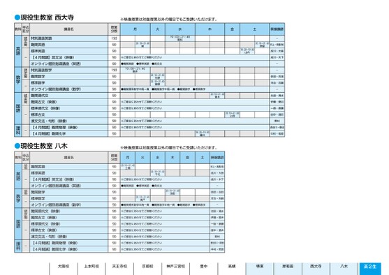 大阪校上本町校天王寺校京都校神戸三宮校豊中高槻堺東岸和田西大寺八木高2生※映像授業は対面授業以外の曜日でもご受講いただけます。月火水木金土映像講師-村上・髙橋(保)成川・大島成川・木下--依田・合田河合・吉嗣-光田・清水伊藤・菅井一路・斎藤田中・酒井野村長谷川・原田中村・若原19:00〜21:40国松20:10〜21:40巽※ご都合にあわせてご視聴ください●難関英語●標準英語●英文法20:10〜21:40津留18:20〜19:50山内19:00〜21:40駒井20:10〜21:4020:10〜21:40杉原数野●難関理系数学中高一貫●難関数学中高一貫●難関数学●標準数学※ご都合にあわせてご視聴ください※ご都合にあわせてご視聴ください※ご都合にあわせてご視聴ください※ご都合にあわせてご視聴ください20:10〜21:40青木20:10〜21:40上田18:20〜19:50福井※映像授業は対面授業以外の曜日でもご受講いただけます。月火水木金土映像講師20:10〜21:40土橋20:10〜21:40千代※ご都合にあわせてご視聴ください●難関英語●標準英語●英文法20:10〜21:40池田20:10〜21:40髙戸村上・髙橋(保)成川・大島成川・木下-依田・合田河合・吉嗣●難関理系数学中高一貫●難関数学中高一貫●難関数学●標準数学-※ご都合にあわせてご視聴ください※ご都合にあわせてご視聴ください※ご都合にあわせてご視聴ください※ご都合にあわせてご視聴ください※ご都合にあわせてご視聴ください※ご都合にあわせてご視聴ください※ご都合にあわせてご視聴ください光田・清水伊藤・菅井一路・斎藤田中・酒井野村長谷川・原田中村・若原授業分数1509090909015090909090909090909090授業分数9090909090909090909090909090西大寺●現役生教室西大寺教科申込区分講座名特別選抜英語難関英語標準英語【4月開講】英文法(映像)オンライン個別指導講座(英語)特別選抜数学難関数学標準数学オンライン個別指導講座(数学)難関現代文難関古文(映像)標準現代文(映像)標準古文漢文文法・句形(映像)【4月開講】難関物理(映像)【4月開講】難関化学認定制-認定制-認定制--英語数学国語理科難関英語標準英語【4月開講】英文法(映像)オンライン個別指導講座(英語)難関数学標準数学オンライン個別指導講座(数学)難関現代文(映像)難関古文(映像)標準現代文(映像)標準古文(映像)漢文文法・句形(映像)【4月開講】難関物理(映像)【4月開講】難関化学(映像)認定制-認定制-認定制--英語数学国語理科教科申込区分講座名八木●現役生教室八木51_5_564_32_20240815170717.csv1ページ●2025年度/51/近畿/西大寺/高2生/パターン6617/2025_51_5_535_32_20240815170717.csv●2025年度51/近/木/高2生/パターン6617/2025_51_5_53了時削除校了時削除1ページ