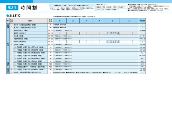 授業形式は、「対面」「オンライン」「映像」があります。「対面」「オンライン(集団)」:授業曜日・時間帯は、以下の時間割をご確認ください。「オンライン(個別)」「映像」:ご都合にあわせてご受講ください。*申込区分について認定制「認定(受講資格)」の取得が必要な講座です。ーどなたでも受講できる講座です。●受験対策講座(映像)のみのお申し込みはできません。受験対策講座(対面/オンライン〈総合型・学校推薦型選抜対策プログラムを除く〉)と組み合わせて、お申し込みください。●同一名称の講座は設置校舎・曜日・時間帯・授業形式が異なっても同一内容です。●担当講師は変更になる場合があります。あらかじめご了承ください。※映像授業は対面授業以外の曜日でもご受講いただけます。月火水木金土映像講師●難関物理●標準物理●難関化学●標準化学90/150※ご都合にあわせてご視聴ください90/15090/150※ご都合にあわせてご視聴ください90/150※ご都合にあわせてご視聴ください90/15090/150※ご都合にあわせてご視聴ください1月〜)18:40〜20:104月〜)18:40〜21:20内藤1月〜)18:40〜20:104月〜)18:40〜21:20寺田※ご都合にあわせてご視聴ください※ご都合にあわせてご視聴ください※ご都合にあわせてご視聴ください※ご都合にあわせてご視聴ください※ご都合にあわせてご視聴ください※ご都合にあわせてご視聴ください※ご都合にあわせてご視聴ください※ご都合にあわせてご視聴ください※ご都合にあわせてご視聴ください--大内・坂本(勝)-田中・西川坂本(新)・沼田-平尾・平松中垣・宮本大野・山口井上中村・中土居松本吉見佐々木河合小野・加賀佐藤・山家●出願書類対策(必須受講)●面接対策(選択制)●小論文対策(選択制)●【プレミアム】過去問対策(選択制)●慶大対策<(法)FITA方式/(法)FITB方式/(文)自主応募制推薦>-授業分数909090909090909015015090-講座名オンライン個別指導講座(物理)オンライン個別指導講座(化学)早慶大日本史(映像)関関同立大日本史日本史(映像)早慶大世界史(映像)関関同立大世界史世界史(映像)【4月開講】共通テスト対策日本史(映像)【4月開講】共通テスト対策世界史(映像)【4月開講】共通テスト対策歴史総合(映像)【4月開講】共通テスト対策地理(映像)【4月開講】共通テスト対策地理総合(映像)【4月開講】共通テスト対策公共(映像)【4月開講】共通テスト対策倫理(映像)【4月開講】共通テスト対策政治・経済(映像)【4月開講】共通テスト対策情報Ⅰ(映像)総合型・学校推薦型選抜対策プログラム教科申込区分-理科-地歴---公民情報総合時間割高3生上本町●上本町校5ページ●2025年度/51/近畿/上本町/高3・卒生/パターン6617/2025_51_5_513_11_20240815170731.csv校了時削除