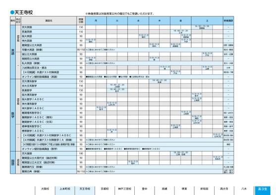 大阪校上本町校天王寺校京都校神戸三宮校豊中高槻堺東岸和田西大寺八木高3生※映像授業は対面授業以外の曜日でもご受講いただけます。月火水木金土映像講師18:40〜21:20江本19:50〜21:20胡摩﨑19:50〜21:20木多18:00〜19:30西内18:00〜19:30胡摩﨑18:00〜19:30慎19:50〜21:20慎18:00〜19:30戸谷18:40〜21:20西浦16:50〜19:30胡摩﨑18:00〜19:30戸谷18:00〜19:3018:00〜19:30田村山崎16:50〜18:20影平16:50〜18:20上高原16:00〜17:30湘田16:00〜17:30山本(洋)----佐野・胡摩﨑柴田(卓)・髙橋(慶)安井・近藤-吉川・大島小林柴田(祐)・守屋--------依田・山本(洋)樋原・宮田樋原・宮田高梨・波平秦野・永島森本・清水森本(啓)清水森本(啓)・清水森本・水湘田----井上・佐藤井上(真)佐藤山村・坂下藤川・西川19:50〜21:20山本(洋)19:50〜21:20佐佐木18:00〜19:30国松19:50〜21:20横井90/150※ご都合にあわせてご視聴ください18:00〜19:30津留※ご都合にあわせてご視聴ください●難関国公立大英語●国公立大英語●私大英語●入試頻出英文法・語法18:40〜21:20上高原18:40〜21:20影平18:00〜19:30山本(洋)19:50〜21:20影平18:00〜19:30岸※ご都合にあわせてご視聴ください※ご都合にあわせてご視聴ください●難関理系数学ⅢC●難関数学ⅠAⅡBC●標準理系数学ⅢC●標準数学ⅠAⅡBC※ご都合にあわせてご視聴ください18:00〜19:30菅井19:50〜21:20上高原18:00〜19:30上高原18:00〜21:20江濵・松尾90/150※ご都合にあわせてご視聴ください授業分数15015090909090909090909015015015090909090909090909090909090180909090京大英語医進英語阪大英語神大英語難関国公立大英語早慶大英語(映像)国公立大英語関関同立大英語私大英語(映像)入試頻出英文法・語法【4月開講】共通テスト対策英語オンライン個別指導講座(英語)京大理系数学京大文系数学医進数学阪大理系数学阪大数学ⅠAⅡBC神大理系数学神大数学ⅠAⅡBC難関理系数学ⅢC難関数学ⅠAⅡBC(理系)難関数学ⅠAⅡBC(文系)標準理系数学ⅢC標準数学ⅠAⅡBC【4月開講】共通テスト対策数学ⅠAⅡBC【4月開講】共通テスト対策数学ⅠA(映像)【4月開講】共通テスト対策数学C「平面上の曲線と複素数平面」映像)オンライン個別指導講座(数学)京大国語難関国公立大現代文(論述対策)難関国公立大古文(論述対策)難関現代文(映像)難関古典(映像)認定制-認定制-英語数学認定制国語天王寺●天王寺校教科申込区分講座名1ページ●2025年度/51/近畿/天王寺/高3・卒生/パターン6617/2025_51_5_515_11_20240819192226.csv校了時削除