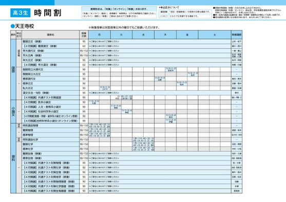 授業形式は、「対面」「オンライン」「映像」があります。「対面」「オンライン(集団)」:授業曜日・時間帯は、以下の時間割をご確認ください。「オンライン(個別)」「映像」:ご都合にあわせてご受講ください。*申込区分について認定制「認定(受講資格)」の取得が必要な講座です。ーどなたでも受講できる講座です。●受験対策講座(映像)のみのお申し込みはできません。受験対策講座(対面/オンライン〈総合型・学校推薦型選抜対策プログラムを除く〉)と組み合わせて、お申し込みください。●同一名称の講座は設置校舎・曜日・時間帯・授業形式が異なっても同一内容です。●担当講師は変更になる場合があります。あらかじめご了承ください。※映像授業は対面授業以外の曜日でもご受講いただけます。月火水木金土※ご都合にあわせてご視聴ください※ご都合にあわせてご視聴ください授業分数906019:50〜21:20佐佐木18:00〜19:30北野19:50〜21:20松村18:00〜19:30松村19:10〜20:4019:10〜20:40宮元伊藤90/150※ご都合にあわせてご視聴ください90/150※ご都合にあわせてご視聴ください※ご都合にあわせてご視聴ください※ご都合にあわせてご視聴ください19:50〜21:20コヤマ※ご都合にあわせてご視聴ください17:20〜18:50大西19:50〜21:20中田・山本(ま)・畑17:20〜18:50神坂19:10〜20:40神坂90609090909090909090909090901月〜)18:40〜20:104月〜)18:40〜21:20吉田1月〜)18:40〜20:104月〜)18:40〜21:20辻居1月〜)18:40〜20:104月〜)18:40〜21:20瀧澤90/15090/15090/15090/15090/15090/15090/150※ご都合にあわせてご視聴ください90/150※ご都合にあわせてご視聴ください90909090909090※ご都合にあわせてご視聴ください※ご都合にあわせてご視聴ください※ご都合にあわせてご視聴ください※ご都合にあわせてご視聴ください※ご都合にあわせてご視聴ください※ご都合にあわせてご視聴ください※ご都合にあわせてご視聴ください1月〜)18:40〜20:104月〜)18:40〜21:20小松1月〜)18:40〜20:104月〜)18:40〜21:20岡内1月〜)18:40〜20:104月〜)18:40〜21:20大野映像講師山村・坂下藤川・西川一瀬・菱山佐河・阿部髙橋・打越佐河・阿部髙橋・打越--奥村・青木近藤・菅井重盛・松浦野村福永・伊藤・江------渡部・坂本佐々木・木村-寺田・青野中村・小松向井・三浦牧島・西尾(健)乾・大學安達・西尾(源)唐牛・長井田島・松永加藤本瀬野黒美難関古文(映像)【4月開講】難関漢文(映像)早大現代文(映像)早大古典(映像)早大古文(映像)【4月開講】早大漢文(映像)関関同立大現代文関関同立大古文標準現代文標準古文私大古文漢文文法・句形(映像)【4月開講】共通テスト対策国語【4月開講】医系小論文【4月開講】人文・教育系小論文【4月開講】社会科学系小論文【4月開講】看護・保健・歯学系小論文(オンライン授業)【4月開講】自然科学系小論文(オンライン授業)特別選抜物理難関物理標準物理特別選抜化学難関化学標準化学難関生物(映像)標準生物(映像)【4月開講】共通テスト対策物理(映像)【4月開講】共通テスト対策化学(映像)【4月開講】共通テスト対策生物(映像)【4月開講】共通テスト対策地学(映像)【4月開講】共通テスト対策物理基礎(映像)【4月開講】共通テスト対策化学基礎(映像)【4月開講】共通テスト対策生物基礎(映像)認定制--認定制-認定制-国語小論文理科教科申込区分講座名時間割高3生天王寺●天王寺校3ページ●2025年度/51/近畿/天王寺/高3・卒生/パターン6617/2025_51_5_515_11_20240819192226.csv校了時削除