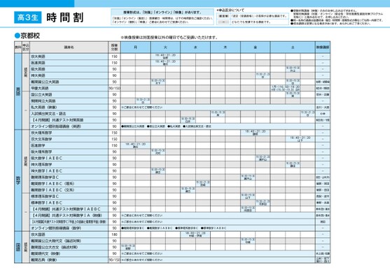 ※映像授業は対面授業以外の曜日でもご受講いただけます。月火水木金土映像講師授業分数15015090909090/1509090909090901501501509090909090909090909090909018090909018:40〜21:2018:40〜21:20佐野横井18:00〜19:30木下19:50〜21:20谷※ご都合にあわせてご視聴ください●難関国公立大英語●国公立大英語●私大英語●入試頻出英文法・語法18:00〜19:30巽18:00〜19:30白井18:40〜21:20瀬古18:00〜19:30河村18:00〜19:30瀬古19:50〜21:20宮崎18:00〜19:30瀬古※ご都合にあわせてご視聴ください※ご都合にあわせてご視聴ください●難関理系数学ⅢC●難関数学ⅠAⅡBC●標準理系数学ⅢC●標準数学ⅠAⅡBC18:00〜21:20中崎・伊賀18:00〜19:30塚野※ご都合にあわせてご視聴ください90/150※ご都合にあわせてご視聴ください19:50〜21:20谷18:00〜19:30片山18:00〜19:301月〜)16:50〜18:204月〜)16:50〜19:30白井18:00〜19:30谷巽----佐野・胡摩﨑柴田(卓)・髙橋(慶)安井・近藤-吉川・大島19:50〜21:20谷小林柴田(祐)・守屋18:40〜21:20藤野18:40〜21:20山下19:50〜21:20瀬戸山18:00〜19:30藤田19:50〜21:20河原田18:00〜19:30瀬戸山18:00〜19:30山下18:00〜19:30河原田18:00〜19:30中崎--------依田・山本(洋)原・宮田樋原・宮田樋高梨・波平秦野・永島森本・清水森本(啓)清水森本・清水森本(啓)清水湘田----井上・佐藤井上(真)・佐藤山村・坂下藤川・西川時間割授業形式は、「対面」「オンライン」「映像」があります。「対面」「オンライン(集団)」:授業曜日・時間帯は、以下の時間割をご確認ください。「オンライン(個別)」「映像」:ご都合にあわせてご受講ください。*申込区分について認定制「認定(受講資格)」の取得が必要な講座です。ーどなたでも受講できる講座です。●受験対策講座(映像)のみのお申し込みはできません。受験対策講座(対面/オンライン〈総合型・学校推薦型選抜対策プログラムを除く〉)と組み合わせて、お申し込みください。●同一名称の講座は設置校舎・曜日・時間帯・授業形式が異なっても同一内容です。●担当講師は変更になる場合があります。あらかじめご了承ください。講座名京大英語医進英語阪大英語神大英語難関国公立大英語早慶大英語国公立大英語関関同立大英語私大英語(映像)入試頻出英文法・語法【4月開講】共通テスト対策英語オンライン個別指導講座(英語)京大理系数学京大文系数学医進数学阪大理系数学阪大数学ⅠAⅡBC神大理系数学神大数学ⅠAⅡBC難関理系数学ⅢC難関数学ⅠAⅡBC(理系)難関数学ⅠAⅡBC(文系)標準理系数学ⅢC標準数学ⅠAⅡBC【4月開講】共通テスト対策数学ⅠAⅡBC【4月開講】共通テスト対策数学ⅠA(映像)【4月開講】共通テスト対策数学C「平面上の曲線と複素数平面」映像)オンライン個別指導講座(数学)京大国語難関国公立大現代文(論述対策)難関国公立大古文(論述対策)難関現代文(映像)難関古典(映像)認定制-認定制-英語数学認定制国語高3生京都●京都校教科申込区分1ページ●2025年度/51/近畿/京都/高3・卒生/パターン6617/2025_51_5_531_11_20240823175918.csv校了時削除