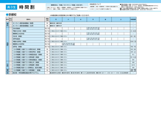 時間割授業形式は、「対面」「オンライン」「映像」があります。「対面」「オンライン(集団)」:授業曜日・時間帯は、以下の時間割をご確認ください。「オンライン(個別)」「映像」:ご都合にあわせてご受講ください。*申込区分について認定制「認定(受講資格)」の取得が必要な講座です。ーどなたでも受講できる講座です。●受験対策講座(映像)のみのお申し込みはできません。受験対策講座(対面/オンライン〈総合型・学校推薦型選抜対策プログラムを除く〉)と組み合わせて、お申し込みください。●同一名称の講座は設置校舎・曜日・時間帯・授業形式が異なっても同一内容です。●担当講師は変更になる場合があります。あらかじめご了承ください。※映像授業は対面授業以外の曜日でもご受講いただけます。月火水木金土映像講師1月〜)18:40〜20:104月〜)18:40〜21:20小倉1月〜)18:40〜20:104月〜)18:40〜21:20高木1月〜)18:40〜20:104月〜)18:40〜21:20上住---大内・坂本(勝)-田中・西川-坂本(新)・沼田-平尾・平松中垣・宮本大野・山口井上中村・中土居松本吉見佐々木河合小野・加賀佐藤・山家●出願書類対策(必須受講)●面接対策(選択制)●小論文対策(選択制)●【プレミアム】過去問対策(選択制)●慶大対策<(法)FITA方式/(法)FITB方式/(文)自主応募制推薦>-授業分数909090/150●難関物理●標準物理●難関化学●標準化学90/150※ご都合にあわせてご視聴ください90/15090/150※ご都合にあわせてご視聴ください90/15090/150※ご都合にあわせてご視聴ください90/1501月〜)18:40〜20:104月〜)18:40〜21:20前田90/150※ご都合にあわせてご視聴ください※ご都合にあわせてご視聴ください※ご都合にあわせてご視聴ください※ご都合にあわせてご視聴ください※ご都合にあわせてご視聴ください※ご都合にあわせてご視聴ください※ご都合にあわせてご視聴ください※ご都合にあわせてご視聴ください※ご都合にあわせてご視聴ください※ご都合にあわせてご視聴ください90909090909015015090-講座名オンライン個別指導講座(物理)オンライン個別指導講座(化学)日本史論述早慶大日本史(映像)関関同立大日本史日本史(映像)世界史論述早慶大世界史(映像)関関同立大世界史世界史(映像)【4月開講】共通テスト対策日本史(映像)【4月開講】共通テスト対策世界史(映像)【4月開講】共通テスト対策歴史総合(映像)【4月開講】共通テスト対策地理(映像)【4月開講】共通テスト対策地理総合(映像)【4月開講】共通テスト対策公共(映像)【4月開講】共通テスト対策倫理(映像)【4月開講】共通テスト対策政治・経済(映像)【4月開講】共通テスト対策情報Ⅰ(映像)総合型・学校推薦型選抜対策プログラム教科申込区分-理科-地歴---公民情報総合高3生京都●京都校5ページ●2025年度/51/近畿/京都/高3・卒生/パターン6617/2025_51_5_531_11_20240823175918.csv校了時削除