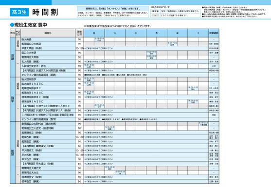 ※映像授業は対面授業以外の曜日でもご受講いただけます。火水木金土映像講師授業分数9090月20:10〜21:40白井90/150※ご都合にあわせてご視聴ください9090909090909090909090909090909090909018:20〜19:5018:20〜19:50下村津留※ご都合にあわせてご視聴ください18:20〜19:50三枝※ご都合にあわせてご視聴ください●国公立大英語●私大英語●入試頻出英文法・語法●難関国公立大英語18:20〜19:5018:20〜19:50数野上村18:20〜19:50杉原※ご都合にあわせてご視聴ください20:10〜21:40上村※ご都合にあわせてご視聴ください※ご都合にあわせてご視聴ください●難関理系数学ⅢC●難関数学ⅠAⅡBC●標準理系数学ⅢC●標準数学ⅠAⅡBC18:20〜19:50瀬島※ご都合にあわせてご視聴ください90/150※ご都合にあわせてご視聴ください9060※ご都合にあわせてご視聴ください※ご都合にあわせてご視聴ください90/150※ご都合にあわせてご視聴ください90/150※ご都合にあわせてご視聴ください906090909090※ご都合にあわせてご視聴ください※ご都合にあわせてご視聴ください18:20〜19:50畑中20:10〜21:40堀※ご都合にあわせてご視聴ください※ご都合にあわせてご視聴ください18:20〜19:50山内18:20〜19:50青木18:20〜19:50吉田20:10〜21:40一番合戦-佐野・胡摩﨑柴田(卓)・髙橋(慶)田髙安井・近藤-安井・近藤小林柴田(祐)・守屋柴田・屋---依田・山本(洋)樋原・宮田高梨・波平秦野・永島森本・清水森本(啓)清水森本・清水森本(啓)清水湘田---井上・佐藤井上(真)佐藤山村・坂下藤川・西川山村・坂下藤川・西川一瀬・菱山佐河・阿部髙橋・打越佐河・阿部髙橋・打越--奥村・青木近藤・菅井高3生時間割授業形式は、「対面」「オンライン」「映像」があります。「対面」「オンライン(集団)」:授業曜日・時間帯は、以下の時間割をご確認ください。「オンライン(個別)」「映像」:ご都合にあわせてご受講ください。*申込区分について認定制「認定(受講資格)」の取得が必要な講座です。ーどなたでも受講できる講座です。●受験対策講座(映像)のみのお申し込みはできません。受験対策講座(対面/オンライン〈総合型・学校推薦型選抜対策プログラムを除く〉)と組み合わせて、お申し込みください。●同一名称の講座は設置校舎・曜日・時間帯・授業形式が異なっても同一内容です。●担当講師は変更になる場合があります。あらかじめご了承ください。阪大英語難関国公立大英語早慶大英語(映像)国公立大英語関関同立大英語私大英語(映像)入試頻出英文法・語法【4月開講】共通テスト対策英語(映像)オンライン個別指導講座(英語)阪大理系数学阪大数学ⅠAⅡBC難関理系数学ⅢC難関数学ⅠAⅡBC標準理系数学ⅢC(映像)標準数学ⅠAⅡBC【4月開講】共通テスト対策数学ⅠAⅡBC【4月開講】共通テスト対策数学ⅠA(映像)【4月開講】共通テスト対策数学C「平面上の曲線と複素数平面」映像)オンライン個別指導講座(数学)難関国公立大現代文(論述対策)難関国公立大古文(論述対策)難関現代文(映像)難関古典(映像)難関古文(映像)【4月開講】難関漢文(映像)早大現代文(映像)早大古典(映像)早大古文(映像)【4月開講】早大漢文(映像)関関同立大現代文関関同立大古文標準現代文(映像)標準古文(映像)認定制-認定制-認定制-英語数学国語教科申込区分講座名豊中豊中●現役生教室豊中1ページ●2025年度/51/近畿/豊中/高3・卒生/パターン6617/2025_51_5_563_11_20240815170731.csv校了時削除3ペ