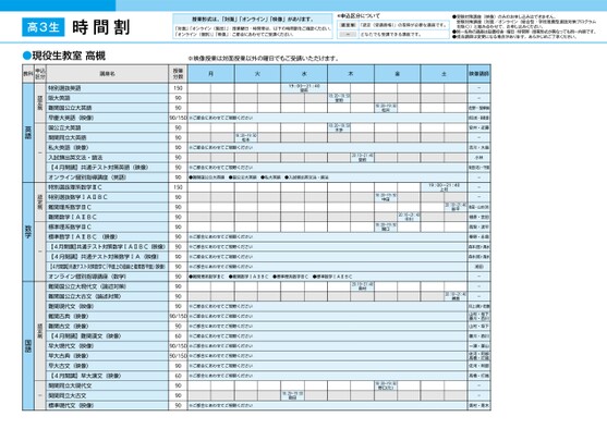 19:00〜21:40堂前18:20〜19:50堂前18:20〜19:50三枝18:20〜19:50松井20:10〜21:40堂前90/150※ご都合にあわせてご視聴ください18:20〜19:50松本※ご都合にあわせてご視聴ください※ご都合にあわせてご視聴ください●難関国公立大英語●国公立大英語●私大英語●入試頻出英文法・語法19:00〜21:40上村20:10〜21:40影平18:20〜19:50中田18:20〜19:50関口20:10〜21:40中川※ご都合にあわせてご視聴ください※ご都合にあわせてご視聴ください※ご都合にあわせてご視聴ください※ご都合にあわせてご視聴ください●難関理系数学ⅢC●難関数学ⅠAⅡBC●標準理系数学ⅢC●標準数学ⅠAⅡBC※ご都合にあわせてご視聴ください20:10〜21:40奥村20:10〜21:40瀬島--佐野・胡摩﨑柴田(卓)・髙橋(慶)安井・近藤-吉川・大島小林柴田(祐)・守屋---依田・山本(洋)原・宮田樋高梨・波平秦野・永島森本・清水森本(啓)・清水森本・清水森本(啓)清水湘田---井上(真)・佐藤井上・藤山村・坂下藤川・西川山村・坂下藤川・西川一瀬・菱山佐河・阿部髙橋・打越佐河・阿部髙橋・打越--奥村・青木授業形式は、「対面」「オンライン」「映像」があります。「対面」「オンライン(集団)」:授業曜日・時間帯は、以下の時間割をご確認ください。「オンライン(個別)」「映像」:ご都合にあわせてご受講ください。*申込区分について認定制「認定(受講資格)」の取得が必要な講座です。ーどなたでも受講できる講座です。●受験対策講座(映像)のみのお申し込みはできません。受験対策講座(対面/オンライン〈総合型・学校推薦型選抜対策プログラムを除く〉)と組み合わせて、お申し込みください。●同一名称の講座は設置校舎・曜日・時間帯・授業形式が異なっても同一内容です。●担当講師は変更になる場合があります。あらかじめご了承ください。※映像授業は対面授業以外の曜日でもご受講いただけます。月火水木金土映像講師90/150※ご都合にあわせてご視聴ください9060※ご都合にあわせてご視聴ください※ご都合にあわせてご視聴ください90/150※ご都合にあわせてご視聴ください90/150※ご都合にあわせてご視聴ください9060909090※ご都合にあわせてご視聴ください※ご都合にあわせてご視聴ください※ご都合にあわせてご視聴ください18:20〜19:50島田18:20〜19:50野口(た)授業分数1509090909090909090150909090909090909090909090特別選抜英語阪大英語難関国公立大英語早慶大英語(映像)国公立大英語関関同立大英語私大英語(映像)入試頻出英文法・語法【4月開講】共通テスト対策英語(映像)オンライン個別指導講座(英語)特別選抜理系数学ⅢC特別選抜数学ⅠAⅡBC難関理系数学ⅢC難関数学ⅠAⅡBC標準理系数学ⅢC標準数学ⅠAⅡBC(映像)【4月開講】共通テスト対策数学ⅠAⅡBC(映像)【4月開講】共通テスト対策数学ⅠA(映像)【4月開講】共通テスト対策数学C「平面上の曲線と複素数平面」映像)オンライン個別指導講座(数学)難関国公立大現代文(論述対策)難関国公立大古文(論述対策)難関現代文(映像)難関古典(映像)難関古文(映像)【4月開講】難関漢文(映像)早大現代文(映像)早大古典(映像)早大古文(映像)【4月開講】早大漢文(映像)関関同立大現代文関関同立大古文標準現代文(映像)認定制-認定制-認定制-英語数学国語教科申込区分講座名高槻教室高3生時間割高槻教室●現役生教室高槻1ページ●2025年度/51/近畿/高槻教室/高3・卒生/パターン6617/2025_51_5_540_11_20240815170731.csv校了時削除3ペ