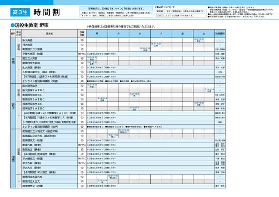 高3生時間割授業形式は、「対面」「オンライン」「映像」があります。「対面」「オンライン(集団)」:授業曜日・時間帯は、以下の時間割をご確認ください。「オンライン(個別)」「映像」:ご都合にあわせてご受講ください。*申込区分について認定制「認定(受講資格)」の取得が必要な講座です。ーどなたでも受講できる講座です。●受験対策講座(映像)のみのお申し込みはできません。受験対策講座(対面/オンライン〈総合型・学校推薦型選抜対策プログラムを除く〉)と組み合わせて、お申し込みください。●同一名称の講座は設置校舎・曜日・時間帯・授業形式が異なっても同一内容です。●担当講師は変更になる場合があります。あらかじめご了承ください。※映像授業は対面授業以外の曜日でもご受講いただけます。月火水木金土映像講師18:20〜19:50山内20:10〜21:40山内18:20〜19:50青木90/150※ご都合にあわせてご視聴ください9090909090909090909090909090909090909018:20〜19:5018:20〜19:50西田金澤※ご都合にあわせてご視聴ください※ご都合にあわせてご視聴ください※ご都合にあわせてご視聴ください●難関国公立大英語18:20〜19:50中田●国公立大英語●私大英語●入試頻出英文法・語法18:20〜19:50岸18:20〜19:50池田20:10〜21:40信岡※ご都合にあわせてご視聴ください※ご都合にあわせてご視聴ください※ご都合にあわせてご視聴ください●難関理系数学ⅢC●難関数学ⅠAⅡBC●標準理系数学ⅢC●標準数学ⅠAⅡBC20:10〜21:40野口(た)18:20〜19:50阪上※ご都合にあわせてご視聴ください20:10〜21:40杉原18:20〜19:50杉原90/150※ご都合にあわせてご視聴ください9060※ご都合にあわせてご視聴ください※ご都合にあわせてご視聴ください90/150※ご都合にあわせてご視聴ください90/150※ご都合にあわせてご視聴ください9060909090※ご都合にあわせてご視聴ください※ご都合にあわせてご視聴ください18:20〜19:50野口(た)20:10〜21:40堀※ご都合にあわせてご視聴ください--佐野・胡摩﨑柴田(卓)・髙橋(慶)安井・近藤-吉川・大島小林柴田(祐)・守屋---依田・山本(洋)原・宮田樋高梨・波平秦野・永島森本・清水森本(啓)・清水森本・清水森本(啓)清水湘田---井上(真)・佐藤井上・藤山村・坂下藤川・西川山村・坂下藤川・西川一瀬・菱山佐河・阿部髙橋・打越佐河・阿部髙橋・打越--奥村・青木授業分数909090阪大英語神大英語難関国公立大英語早慶大英語(映像)国公立大英語関関同立大英語私大英語(映像)入試頻出英文法・語法(映像)【4月開講】共通テスト対策英語(映像)オンライン個別指導講座(英語)阪大理系数学阪大数学ⅠAⅡBC難関理系数学ⅢC難関数学ⅠAⅡBC標準理系数学ⅢC標準数学ⅠAⅡBC【4月開講】共通テスト対策数学ⅠAⅡBC(映像)【4月開講】共通テスト対策数学ⅠA(映像)【4月開講】共通テスト対策数学C「平面上の曲線と複素数平面」映像)オンライン個別指導講座(数学)難関国公立大現代文(論述対策)難関国公立大古文(論述対策)難関現代文(映像)難関古典(映像)難関古文(映像)【4月開講】難関漢文(映像)早大現代文(映像)早大古典(映像)早大古文(映像)【4月開講】早大漢文(映像)関関同立大現代文関関同立大古文標準現代文(映像)認定制-認定制-認定制-英語数学国語教科申込区分講座名堺東堺東●現役生教室堺東1ページ●2025年度/51/近畿/堺東/高3・卒生/パターン6617/2025_51_5_533_11_20240815170731.csv校了時削除3ペ