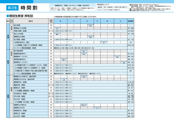 授業形式は、「対面」「オンライン」「映像」があります。「対面」「オンライン(集団)」:授業曜日・時間帯は、以下の時間割をご確認ください。「オンライン(個別)」「映像」:ご都合にあわせてご受講ください。*申込区分について認定制「認定(受講資格)」の取得が必要な講座です。ーどなたでも受講できる講座です。●受験対策講座(映像)のみのお申し込みはできません。受験対策講座(対面/オンライン〈総合型・学校推薦型選抜対策プログラムを除く〉)と組み合わせて、お申し込みください。●同一名称の講座は設置校舎・曜日・時間帯・授業形式が異なっても同一内容です。●担当講師は変更になる場合があります。あらかじめご了承ください。※映像授業は対面授業以外の曜日でもご受講いただけます。月火水木金土映像講師18:20〜19:50千代90/150※ご都合にあわせてご視聴ください18:20〜19:50藤森※ご都合にあわせてご視聴ください※ご都合にあわせてご視聴ください20:10〜21:40松井20:10〜21:40敦見18:20〜19:50巽●難関国公立大英語●国公立大英語●私大英語●入試頻出英文法・語法18:20〜19:5018:20〜19:50影平中川20:10〜21:40関口※ご都合にあわせてご視聴ください※ご都合にあわせてご視聴ください※ご都合にあわせてご視聴ください●難関理系数学ⅢC●難関数学ⅠAⅡBC●標準理系数学ⅢC●標準数学ⅠAⅡBC20:10〜21:40上田※ご都合にあわせてご視聴ください18:20〜19:50中田90/150※ご都合にあわせてご視聴ください9060※ご都合にあわせてご視聴ください※ご都合にあわせてご視聴ください90/150※ご都合にあわせてご視聴ください90/150※ご都合にあわせてご視聴ください90609090909090※ご都合にあわせてご視聴ください※ご都合にあわせてご視聴ください※ご都合にあわせてご視聴ください※ご都合にあわせてご視聴ください※ご都合にあわせてご視聴ください18:20〜19:50野口(た)20:10〜21:40コヤマ18:20〜19:50池田20:10〜21:40池田-佐野・胡摩﨑柴田(卓)髙橋(慶)田髙安井・近藤-吉川・大島小林柴田(祐)・守屋柴田・屋--依田・山本(洋)樋原・宮田高梨・波平秦野・永島森本・清水森本(啓)清水森本(啓)・清水森本・水湘田---井上・佐藤井上(真)佐藤山村・坂下藤川・西川山村・坂下藤川・西川一瀬・菱山佐河・阿部髙橋・打越佐河・阿部髙橋・打越--奥村・青木近藤・菅井重盛・松浦授業分数9090909090909090909090909090909090909090阪大英語難関国公立大英語早慶大英語(映像)国公立大英語関関同立大英語私大英語(映像)入試頻出英文法・語法【4月開講】共通テスト対策英語(映像)オンライン個別指導講座(英語)阪大理系数学難関理系数学ⅢC難関数学ⅠAⅡBC標準理系数学ⅢC標準数学ⅠAⅡBC【4月開講】共通テスト対策数学ⅠAⅡBC(映像)【4月開講】共通テスト対策数学ⅠA(映像)【4月開講】共通テスト対策数学C「平面上の曲線と複素数平面」映像)オンライン個別指導講座(数学)難関国公立大現代文(論述対策)難関国公立大古文(論述対策)難関現代文(映像)難関古典(映像)難関古文(映像)【4月開講】難関漢文(映像)早大現代文(映像)早大古典(映像)早大古文(映像)【4月開講】早大漢文(映像)関関同立大現代文関関同立大古文標準現代文(映像)標準古文(映像)私大古文(映像)認定制-認定制-認定制-英語数学国語教科申込区分講座名高3生時間割岸和田●現役生教室岸和田1ページ●2025年度/51/近畿/岸和田/高3・卒生/パターン6617/2025_51_5_564_11_20240815181138.csv校了時削除