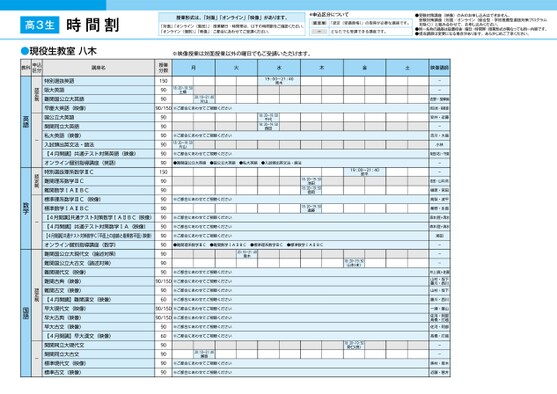 ※映像授業は対面授業以外の曜日でもご受講いただけます。月火水木金土映像講師授業分数150909018:20〜19:50土橋20:10〜21:40片山19:00〜21:40青木90/150※ご都合にあわせてご視聴ください909090909090150909090909090909090909018:20〜19:5018:20〜19:50千代西田※ご都合にあわせてご視聴ください18:20〜19:50片山※ご都合にあわせてご視聴ください●難関国公立大英語●国公立大英語●私大英語●入試頻出英文法・語法18:20〜19:5018:20〜19:50池田信岡※ご都合にあわせてご視聴ください※ご都合にあわせてご視聴ください※ご都合にあわせてご視聴ください※ご都合にあわせてご視聴ください18:20〜19:50進藤●難関理系数学ⅢC●難関数学ⅠAⅡBC●標準理系数学ⅢC●標準数学ⅠAⅡBC20:10〜21:40青木※ご都合にあわせてご視聴ください90/150※ご都合にあわせてご視聴ください9060※ご都合にあわせてご視聴ください※ご都合にあわせてご視聴ください90/150※ご都合にあわせてご視聴ください90/150※ご都合にあわせてご視聴ください906090909090※ご都合にあわせてご視聴ください※ご都合にあわせてご視聴ください20:10〜21:40瀬島※ご都合にあわせてご視聴ください※ご都合にあわせてご視聴ください--佐野・胡摩﨑柴田(卓)・髙橋(慶)安井・近藤-吉川・大島小林柴田(祐)・守屋--依田・山本(洋)樋原・宮田高梨・波平秦野・永島森本・清水森本(啓)清水森本(啓)・清水森本・水湘田---井上・佐藤井上(真)佐藤山村・坂下藤川・西川山村・坂下藤川・西川一瀬・菱山佐河・阿部髙橋・打越佐河・阿部髙橋・打越--奥村・青木近藤・菅井19:00〜21:40影平18:20〜19:50山本(ま)18:20〜19:50野口(良)高3生時間割授業形式は、「対面」「オンライン」「映像」があります。「対面」「オンライン(集団)」:授業曜日・時間帯は、以下の時間割をご確認ください。「オンライン(個別)」「映像」:ご都合にあわせてご受講ください。*申込区分について認定制「認定(受講資格)」の取得が必要な講座です。ーどなたでも受講できる講座です。●受験対策講座(映像)のみのお申し込みはできません。受験対策講座(対面/オンライン〈総合型・学校推薦型選抜対策プログラムを除く〉)と組み合わせて、お申し込みください。●同一名称の講座は設置校舎・曜日・時間帯・授業形式が異なっても同一内容です。●担当講師は変更になる場合があります。あらかじめご了承ください。特別選抜英語阪大英語難関国公立大英語早慶大英語(映像)国公立大英語関関同立大英語私大英語(映像)入試頻出英文法・語法【4月開講】共通テスト対策英語(映像)オンライン個別指導講座(英語)特別選抜理系数学ⅢC難関理系数学ⅢC難関数学ⅠAⅡBC標準理系数学ⅢC(映像)標準数学ⅠAⅡBC【4月開講】共通テスト対策数学ⅠAⅡBC(映像)【4月開講】共通テスト対策数学ⅠA(映像)【4月開講】共通テスト対策数学C「平面上の曲線と複素数平面」映像)オンライン個別指導講座(数学)難関国公立大現代文(論述対策)難関国公立大古文(論述対策)難関現代文(映像)難関古典(映像)難関古文(映像)【4月開講】難関漢文(映像)早大現代文(映像)早大古典(映像)早大古文(映像)【4月開講】早大漢文(映像)関関同立大現代文関関同立大古文標準現代文(映像)標準古文(映像)認定制-認定制-認定制-英語数学国語教科申込区分講座名八木●現役生教室八木1ページ●2025年度/51/近畿/八木/高3・卒生/パターン6617/2025_51_5_538_11_20240823175918.csv校了時削除