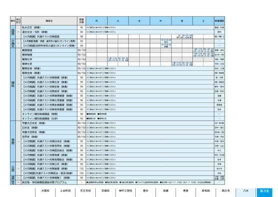 授業分数909090909090/15090/15090/15090/150月火水木金土※ご都合にあわせてご視聴ください※ご都合にあわせてご視聴ください19:10〜20:4019:10〜20:40宮元伊藤20:10〜21:40野口(良)・山本(ま)1月〜)19:00〜20:304月〜)19:00〜21:40大野1月〜)19:00〜20:304月〜)19:00〜21:40植田1月〜)19:00〜20:304月〜)19:00〜21:40大學1月〜)19:00〜20:304月〜)19:00〜21:40本瀬90/150※ご都合にあわせてご視聴ください90/150※ご都合にあわせてご視聴ください90909090909090909090※ご都合にあわせてご視聴ください※ご都合にあわせてご視聴ください※ご都合にあわせてご視聴ください※ご都合にあわせてご視聴ください※ご都合にあわせてご視聴ください※ご都合にあわせてご視聴ください※ご都合にあわせてご視聴ください※ご都合にあわせてご視聴ください●難関物理●標準物理●難関化学●標準化学90/150※ご都合にあわせてご視聴ください90/150※ご都合にあわせてご視聴ください90/150※ご都合にあわせてご視聴ください90/150※ご都合にあわせてご視聴ください※ご都合にあわせてご視聴ください※ご都合にあわせてご視聴ください※ご都合にあわせてご視聴ください※ご都合にあわせてご視聴ください※ご都合にあわせてご視聴ください※ご都合にあわせてご視聴ください※ご都合にあわせてご視聴ください※ご都合にあわせてご視聴ください月火水木金土※ご都合にあわせてご視聴ください小野・加賀佐藤・山家●出願書類対策(必須受講)●面接対策(選択制)●小論文対策(選択制)●【プレミアム】過去問対策(選択制)●慶大対策<(法)FITA方式/(法)FITB方式/(文)自主応募制推薦>-映像講師重盛・松浦野村福永・伊藤・江--渡部・坂本佐々木・木村寺田・青野中村・小松向井・三浦牧島・西尾(健)乾・大學安達・西尾(源)唐牛・長井田島・松永加藤本瀬野黒美松永--大内・坂本(勝)田中・西川坂本(新)・沼田平尾・平松中垣・宮本大野・山口井上中村・中土居松本吉見佐々木映像講師河合大阪校上本町校天王寺校京都校神戸三宮校豊中高槻堺東岸和田西大寺八木高3生909090909090150授業分数15090-私大古文(映像)漢文文法・句形(映像)【4月開講】共通テスト対策国語【4月開講】看護・保健・歯学系小論文(オンライン授業)【4月開講】自然科学系小論文(オンライン授業)難関物理標準物理難関化学標準化学難関生物(映像)標準生物(映像)【4月開講】共通テスト対策物理(映像)【4月開講】共通テスト対策化学(映像)【4月開講】共通テスト対策生物(映像)【4月開講】共通テスト対策地学(映像)【4月開講】共通テスト対策物理基礎(映像)【4月開講】共通テスト対策化学基礎(映像)【4月開講】共通テスト対策生物基礎(映像)【4月開講】共通テスト対策地学基礎(映像)オンライン個別指導講座(物理)オンライン個別指導講座(化学)早慶大日本史(映像)日本史(映像)早慶大世界史(映像)世界史(映像)【4月開講】共通テスト対策日本史(映像)【4月開講】共通テスト対策世界史(映像)【4月開講】共通テスト対策歴史総合(映像)【4月開講】共通テスト対策地理(映像)【4月開講】共通テスト対策地理総合(映像)【4月開講】共通テスト対策公共(映像)【4月開講】共通テスト対策倫理(映像)【4月開講】共通テスト対策政治・経済(映像)【4月開講】共通テスト対策情報Ⅰ(映像)総合型・学校推薦型選抜対策プログラム講座名--国語小論文-理科-地歴八木-教科申込区分公民--情報総合八木教科申込区分講座名3ページ●2025年度/51/近畿/八木/高3・卒生/パターン6617/2025_51_5_538_11_20240823175918.csv2校了時削除5ページ●2025年度/51/近畿/