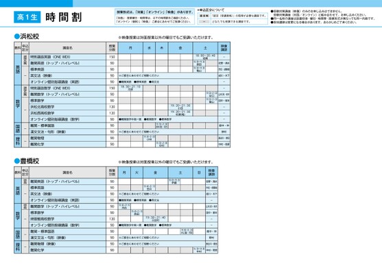 時間割授業形式は、「対面」「オンライン」「映像」があります。「対面」:授業曜日・時間帯は、以下の時間割をご確認ください。「オンライン(個別)」「映像」:ご都合にあわせてご受講ください。*申込区分について認定制「認定(受講資格)」の取得が必要な講座です。ーどなたでも受講できる講座です。●受験対策講座(映像)のみのお申し込みはできません。受験対策講座(対面/オンライン)と組み合わせて、お申し込みください。●同一名称の講座は設置校舎・曜日・時間帯・授業形式が異なっても同一内容です。●担当講師は変更になる場合があります。あらかじめご了承ください。講座名講座名特別選抜英語(ONEWEX)難関英語(トップ・ハイレベル)標準英語英文法(映像)オンライン個別指導講座(英語)特別選抜数学(ONEWEX)難関数学(トップ・ハイレベル)標準数学浜松北高校数学浜松西高校数学オンライン個別指導講座(数学)難関・標準国語漢文文法・句形(映像)難関物理難関化学-難関英語(トップ・ハイレベル)標準英語英文法(映像)オンライン個別指導講座(英語)難関数学(トップ・ハイレベル)-標準数学時習館高校数学オンライン個別指導講座(数学)-難関・標準国語漢文文法・句形(映像)-難関物理(映像)難関化学認定制認定制-認定制数学-国語理科--英語数学国語理科豊橋●豊橋校高1生浜松●浜松校1ページ教科申込区分認定制豊橋英語教科申込区分●2025年度/51/中部/浜松/高1生/パターン6620/2025_51_4_433_31_20240815134738.csv●2年度51/中/豊橋/高1生/パターン6620/202校了時削除1ージ1ページ●2025年度/51/中部/豊橋/高1生/パターン6620/2025_51_4_411_31_20240815134738.csv校了時削除※映像授業は対面授業以外の曜日でもご受講いただけます。月水木金土授業分数1509090909090909090909090授業分数90909090月火※ご都合にあわせてご視聴ください金●難関英語●標準英語●英文法15018:30〜21:1019:40〜21:10河原笠井90※ご都合にあわせてご視聴ください●標準英語●英文法●難関英語19:40〜21:10河合9012012019:40〜21:10西田12090●難関数学中高一貫19:30〜21:40●難関数学三田村●標準数学90●難関数学中高一貫●難関数学●標準数学19:30〜21:00鈴木(理)・河合90※ご都合にあわせてご視聴ください90※ご都合にあわせてご視聴ください19:30〜21:00小林90※ご都合にあわせてご視聴ください土日18:00〜19:30伊藤19:20〜21:30小田19:20〜21:30村瀬(竜)19:50〜21:20井上(真)・河合19:30〜21:00中村16:30〜18:00中村映像講映像講師師-佐野・清水市位・胡摩﨑成川・木下--山本(洋)・府木本・府木田中・塚本---畑中・仲野村長谷川・原田中村・若原18:00〜20:40岩崎18:00〜19:30原田18:00〜19:30亀山像講師佐野・清水市位・胡摩﨑19:50〜21:20成川・木下谷口-19:50〜21:20鷲山山本・府木田中・塚本--畑中・仲野村長谷川・原田中村・若原※映像授業は対面授業以外の曜日でもご受講いただけます。月火金土日18:00〜19:30伊藤19:40〜21:10笠井※ご都合にあわせてご視聴ください●標準英語●英文法●難関英語19:40〜21:10河合19:40〜21:10西田19:30〜21:40三田村●難関数学中高一貫●難関数学●標準数学※ご都合にあわせてご視聴ください※ご都合にあわせてご視聴ください19:50〜21:20井上(真)・河合16:30〜18:00中村映像講映像講師師佐野・清水市位・胡摩﨑成川・木下-山本・府木本(洋)・府木田中・塚本--畑中・仲野村長谷川・原田中村・若原授業分数9090909090901209090909090難関英語(トップ・ハイレベル)標準英語英文法(映像)オンライン個別指導講座(英語)難関数学(トップ・ハイレベル)標準数学時習館高校数学オンライン個別指導講座(数学)難関・標準国語漢文文法・句形(映像)難関物理(映像)難関化学認定制-認定制---英語数学国語理科教科申込区分講座名