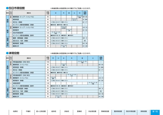 名駅校千種校星ヶ丘現役館岐阜校浜松校豊橋校刈谷現役館岡崎現役館豊田現役館四日市現役館津現役館高1生佐野・清水市位・胡摩﨑成川・木下-山本・府木本(洋)・府木田中・塚本--畑中・仲野村長谷川・原田中村・若原映像講師-佐野・清水市位・胡摩﨑成川・木下--山本・府木田中・塚本-映像講-映像講師師15:30〜17:00長瀬19:00〜20:30佐々木※ご都合にあわせてご視聴ください●難関英語●標準英語●英文法19:30〜21:00江澤木金土●標準数学19:10〜21:50伊藤19:30〜21:00山田(龍)月19:30〜21:40火西畑水授業分数120●難関数学中高一貫●難関数学※ご都合にあわせてご視聴ください渡部19:30〜21:00※ご都合にあわせてご視聴ください※ご都合にあわせてご視聴ください90※ご都合にあわせてご視聴ください※ご都合にあわせてご視聴ください90●難関英語90●標準英語19:30〜21:00●英文太田19:10〜21:50河合19:30〜21:00高原※ご都合にあわせてご視聴ください※映像授業は対面授業以外の曜日でもご受講いただけます。月●難関数学中高一貫火水●難関数学●標準数学木金19:20〜21:30斉藤土※ご都合にあわせてご視聴ください150※ご都合にあわせてご視聴ください19:30〜21:00渡部※ご都合にあわせてご視聴ください※ご都合にあわせてご視聴ください19:30〜21:00※ご都合にあわせてご視聴ください太田●難関英語●標準英語●英文法19:30〜21:00高原19:10〜21:50河合※ご都合にあわせてご視聴ください●難関数学中高一貫●難関数学●標準数学※ご都合にあわせてご視聴ください※ご都合にあわせてご視聴ください※ご都合にあわせてご視聴ください19:30〜21:00太田19:10〜21:50伊藤畑中・仲-野村佐野・清水長谷川・原田市位・胡摩﨑中村・若原成川・木下19:20〜21:30斉藤--山本・府木本(洋)・府木田中・塚本--畑中・仲野村長谷川・原田中村・若原15090909090150909012090909090909090909090909090授業分数9090909015090901209090909090講座名難関英語(トップ・ハイレベル)標準英語英文法(映像)オンライン個別指導講座(英語)難関数学(トップ・ハイレベル)標準数学四日市高校数学オンライン個別指導講座(数学)難関・標準国語(映像)漢文文法・句形(映像)難関物理(映像)難関化学-特別選抜英語(ONEWEX)難関英語(ハイレベル)-標準英語(映像)英文法(映像)-オンライン個別指導講座(英語)特別選抜数学(ONEWEX)難関数学(ハイレベル)標準数学(映像)津高校数学オンライン個別指導講座(数学)難関・標準国語(映像)漢文文法・句形(映像)難関物理(映像)難関化学-特別選抜英語(ONEWEX)難関英語(ハイレベル)標準英語(映像)英文法(映像)オンライン個別指導講座(英語)特別選抜数学(ONEWEX)難関数学(ハイレベル)標準数学(映像)津高校数学オンライン個別指導講座(数学)難関・標準国語(映像)漢文文法・句形(映像)難関物理(映像)難関化学認定制-認定制講座名認定制認定制---数学国語理科英語数学科申込分津教認定制国語-理科英語--英語国語理科●津現役館数学-科申込区分津教認定制※映像授業は対面授業以外の曜日でもご受講いただけます。四日市●四日市現役館1ページ教科申込区分講座名授業分数水木金土日映像講映像講師師●2025年度/51/中部/四日市/高1生/パターン6620/2025_51_4_435_31_20240815134738.csv●2025/51/中部/津高1/ターン6620/2025_51_4_432_31_20240校了時削1ページ1ページ●2025年度/51/中部/津/高1生/パターン6620/2025_51_4_432_31_20240815134738.csv校了時削除