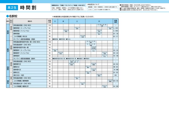 授業形式は、「対面」「オンライン」「映像」があります。「対面」:授業曜日・時間帯は、以下の時間割をご確認ください。「オンライン(個別)」「映像」:ご都合にあわせてご受講ください。*申込区分について認定制「認定(受講資格)」の取得が必要な講座です。ーどなたでも受講できる講座です。●受験対策講座(映像)のみのお申し込みはできません。受験対策講座(対面/オンライン)と組み合わせて、お申し込みください。●同一名称の講座は設置校舎・曜日・時間帯・授業形式が異なっても同一内容です。●担当講師は変更になる場合があります。あらかじめご了承ください。※映像授業は対面授業以外の曜日でもご受講いただけます。火金土15:40〜17:10松岡19:50〜21:20松延●難関英語●標準英語●英文法17:30〜19:00永瀬日13:50〜16:30玉置13:50〜15:20市位13:50〜15:20笠井10:10〜12:5010:10〜12:50野村加藤11:20〜12:50山田(龍)11:20〜12:50大上19:50〜21:20笠岡18:00〜19:30大庭●難関理系数学中高一貫●難関数学中高一貫●難関数学●標準数学15:40〜17:10河原15:40〜17:10杉山11:20〜12:50高橋11:20〜12:50日嵩09:30〜11:00横井09:30〜11:00笹森13:50〜15:20野村14:20〜17:10高橋・山村・江13:50〜15:20安達15:40〜17:10坂本17:30〜19:00瀬木映像講映像講師師17:30〜19:00松延-村上・髙橋(保)村上・髙橋(保)成川・大島成川・木下----依田・合田依田・合田河合・吉嗣--光田・清水伊藤・菅井一路・斎藤田中・酒井野村-17:30〜19:00西浦長谷川・原田-中村・若原15:40〜17:10花田授業分数15090909090901501509090909090150909090909090909090高2生時間割名駅校●名駅校教科申込区分講座名特別選抜英語(ONEWEX)難関英語(トップレベル)難関英語(ハイレベル)標準英語【4月開講】英文法オンライン個別指導講座(英語)特別選抜理系数学中高一貫(ONEWEX)特別選抜数学(ONEWEX)難関理系数学中高一貫難関数学(トップレベル)難関数学(ハイレベル)標準数学オンライン個別指導講座(数学)特別選抜国語(ONEWEX)難関現代文難関古文標準現代文標準古文漢文文法・句形特別選抜物理(ONEWEX)【4月開講】難関物理特別選抜化学(ONEWEX)【4月開講】難関化学認定制-認定制-認定制-認定制-認定制-英語数学国語理科1ページ●2025年度/51/中部/名駅校/高2生/パターン6620/2025_51_4_414_32_20240815134738.csv校了時削除