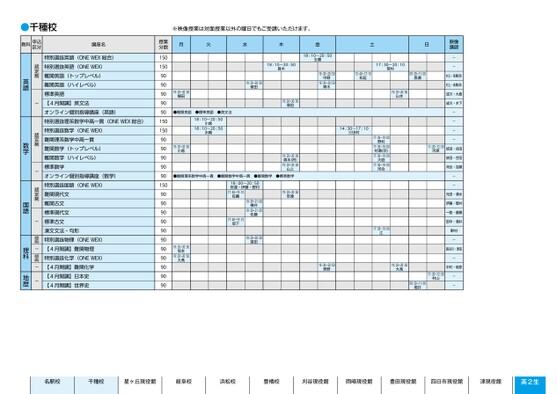 ※映像授業は対面授業以外の曜日でもご受講いただけます。月火水木金土日18:10〜20:50玉置19:20〜20:50中野19:20〜20:50青木18:10〜20:50登木19:20〜20:50塚田19:20〜20:50塚田17:30〜20:10笹村15:40〜17:10松延09:30〜11:00長瀬19:20〜20:50山本映像講映像講師師--村上・髙橋(保)村上・髙橋(保)成川・大島成川・木下----依田・合田依田・合田河合・吉嗣--光田・清水伊藤・菅井一路・斎藤田中・酒井野村-長谷川・原田-中村・若原--14:30〜17:10三田村19:20〜20:50森本(将)19:20〜20:50山上●標準数学19:20〜20:50安達17:30〜19:00野村17:30〜19:00村瀬(宗)17:30〜19:00大庭17:30〜19:00河合11:20〜12:50河原19:20〜20:50窪田17:30〜19:00江19:20〜20:50青野19:20〜20:50大髙11:20〜12:50村山09:30〜11:00堀井19:20〜20:50植田●難関英語19:20〜20:50小倉●標準英語18:10〜20:50●英文法18:10〜20:50小倉水嶋●難関理系数学中高一貫●難関数学中高一貫●難関数学18:00〜20:50安達・伊藤・野村17:40〜19:10佐藤19:30〜21:00横井19:30〜21:00佐藤17:40〜19:10坂下19:20〜20:50坂本19:20〜20:50大髙授業分数150150909090909015015090909090901509090909090909090909090特別選抜英語(ONEWEX総合)特別選抜英語(ONEWEX)難関英語(トップレベル)難関英語(ハイレベル)標準英語【4月開講】英文法オンライン個別指導講座(英語)特別選抜理系数学中高一貫(ONEWEX総合)特別選抜数学(ONEWEX)難関理系数学中高一貫難関数学(トップレベル)難関数学(ハイレベル)標準数学オンライン個別指導講座(数学)特別選抜国語(ONEWEX)難関現代文難関古文標準現代文標準古文漢文文法・句形特別選抜物理(ONEWEX)【4月開講】難関物理特別選抜化学(ONEWEX)【4月開講】難関化学【4月開講】日本史【4月開講】世界史認定制-認定制-認定制-認定制-認定制--英語数学国語理科地歴千種●千種校教科申込区分講座名1ページ●2025年度/51/中部/千種/高2生/パターン6620/2025_51_4_413_32_20240815134738.csv校了時削除名駅校千種校星ヶ丘現役館岐阜校浜松校豊橋校刈谷現役館岡崎現役館豊田現役館四日市現役館津現役館高2生