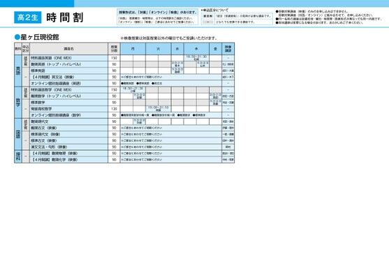 授業形式は、「対面」「オンライン」「映像」があります。「対面」:授業曜日・時間帯は、以下の時間割をご確認ください。「オンライン(個別)」「映像」:ご都合にあわせてご受講ください。*申込区分について認定制「認定(受講資格)」の取得が必要な講座です。ーどなたでも受講できる講座です。●受験対策講座(映像)のみのお申し込みはできません。受験対策講座(対面/オンライン)と組み合わせて、お申し込みください。●同一名称の講座は設置校舎・曜日・時間帯・授業形式が異なっても同一内容です。●担当講師は変更になる場合があります。あらかじめご了承ください。※映像授業は対面授業以外の曜日でもご受講いただけます。月火水木金18:50〜21:30松岡19:20〜20:50山本20:00〜21:30青木19:20〜20:50桑野※ご都合にあわせてご視聴ください●難関英語●標準英語●英文法18:50〜21:30小栗19:20〜20:50吉嗣19:00〜21:10斉藤●難関理系数学中高一貫●難関数学中高一貫●難関数学●標準数学19:20〜20:50平野※ご都合にあわせてご視聴ください※ご都合にあわせてご視聴ください※ご都合にあわせてご視聴ください※ご都合にあわせてご視聴ください※ご都合にあわせてご視聴ください※ご都合にあわせてご視聴ください20:00〜21:30高田19:20〜20:50斉藤映像講映像講師師-村上・髙橋(保)成川・大島成川・木下--依田・合田河合・吉嗣--光田・清水伊藤・菅井一路・斎藤田中・酒井野村長谷川・原田中村・若原授業分数1509090909015090901209090909090909090高2生時間割星ヶ丘●星ヶ丘現役館教科申込区分講座名特別選抜英語(ONEWEX)難関英語(トップ・ハイレベル)標準英語【4月開講】英文法(映像)オンライン個別指導講座(英語)特別選抜数学(ONEWEX)難関数学(トップ・ハイレベル)標準数学菊里高校数学オンライン個別指導講座(数学)難関現代文難関古文(映像)標準現代文(映像)標準古文(映像)漢文文法・句形(映像)【4月開講】難関物理(映像)【4月開講】難関化学(映像)認定制-認定制-認定制--英語数学国語理科1ページ●2025年度/51/中部/星ヶ丘/高2生/パターン6620/2025_51_4_439_32_20240815134738.csv校了時削除