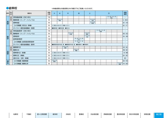 ※映像授業は対面授業以外の曜日でもご受講いただけます。火木水木金土土土日火授業水分数15019:50〜21:2090室田9019:50〜21:20室田19:20〜20:50川野19:20〜20:50村瀬※ご都合にあわせてご視聴ください※にあわせてご視聴ください90●難関英語90●標準英語●難関英語文法●標準英語●英文法19:50〜21:20小栗19:50〜21:20小栗17:20〜18:50宮田17:20〜18:50小田19:20〜21:30谷口谷口19:20〜21:30谷口谷口19:20〜21:3019:20〜21:30●難関理系数学中高一貫90●難関数学中高一貫関数標準数学難関数学●標準数学●難関理系数学中高一貫関数一貫18:00〜19:30佐藤18:00〜19:30佐藤19:50〜21:20伊藤19:50〜21:20伊藤※ご都合にあわせてご視聴ください※にあわせてご視聴ください90※ご都合にあわせてご視聴ください※にあわせてご視聴ください90※ご都合にあわせてご視聴ください19:50〜21:20※にあわせてご視聴ください19:50〜21:20西浦西浦1509090120120909090909019:20〜20:50川野19:20〜20:50村瀬13:30〜16:10盧山10:00〜12:40西畑10:00〜12:40西畑17:20〜18:50宮田17:20〜18:50小田日映像講映像講師13:30〜16:10師-盧山村上・髙橋(保)成川・大島成川・木下--依田・合田河合・吉嗣---光田・清水伊藤・菅井一路・斎藤田中・酒井野村長谷川・原田中村・若原17:00〜18:30若原17:00〜18:30若原映像講師-村上・髙橋(保)成川・大島成川・木下--依田・合田河合・吉嗣---光田・清水伊藤・菅井一路・斎藤田中・酒井野村長谷川・原田中村・若原授業分数1509090909015090901201209090909090909090特別選抜英語(ONEWEX)難関英語(トップ・ハイレベル)標準英語【4月開講】英文法(映像)オンライン個別指導講座(英語)特別選抜数学(ONEWEX)難関数学(トップ・ハイレベル)標準数学岐阜高校数学-【4月開講】岐阜高校理系数学オンライン個別指導講座(数学)難関現代文難関古文標準現代文(映像)標準古文(映像)漢文文法・句形(映像)【4月開講】難関物理【4月開講】難関化学特別抜語(ONEWEX)難関英語(トップ・ハイレベル)標準英語【4月開講】英文法(映像)オンライン個別指導講座(英語)特別選抜学(ONEWEX)難関数学(トップ・ハイレベル)標準数学岐阜高校数学【4月開講】岐阜高校理系数学オンライン個別指導講座(数学)難関現代文難関古文標準現代文(映像)標準古文(映像)漢文文法・句形(映像)【4月開講】難関物理【4月開講】難関化学英語数学国語理科認定制認定制認定制---申込区分教科申込区分講座名講座名岐阜●岐阜校1ページ岐阜●2025年度/51/中部/岐阜/高2生/パターン6620/2025_51_4_412_32_20240815134738.csv認定制-認定制-認定制--名駅校千種校星ヶ丘現役館岐阜校浜松校豊橋校刈谷現役館岡崎現役館豊田現役館四日市現役館津現役館高2生校了時削除