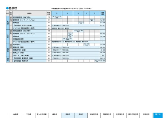 名駅校千種校星ヶ丘現役館岐阜校浜松校豊橋校刈谷現役館岡崎現役館豊田現役館四日市現役館津現役館高2生※映像授業は対面授業以外の曜日でもご受講いただけます。月火木土日映像講映像講師師19:00〜21:40川野※ご都合にあわせてご視聴ください●難関英語●標準英語●英文法19:40〜21:1019:40〜21:10河合河合19:40〜21:1019:40〜21:10三輪三輪19:30〜21:40三田村14:40〜16:10原田20:10〜21:40市位19:00〜21:40福眞●難関理系数学中高一貫●難関数学中高一貫●難関数学●標準数学19:50〜21:20安達※ご都合にあわせてご視聴ください※ご都合にあわせてご視聴ください※ご都合にあわせてご視聴ください※ご都合にあわせてご視聴ください※ご都合にあわせてご視聴ください-村上・髙橋(保)成川・大島成川・木下--依田・合田河合・吉嗣--光田・清水伊藤・菅井一路・斎藤田中・酒井野村長谷川・原田中村・若原16:30〜18:00中村授業分数1509090909015090901209090909090909090特別選抜英語(ONEWEX)難関英語(トップ・ハイレベル)標準英語【4月開講】英文法(映像)オンライン個別指導講座(英語)特別選抜数学(ONEWEX)難関数学(トップ・ハイレベル)標準数学時習館高校数学オンライン個別指導講座(数学)難関現代文難関古文(映像)標準現代文(映像)標準古文(映像)漢文文法・句形(映像)【4月開講】難関物理(映像)【4月開講】難関化学認定制-認定制-認定制--英語数学国語理科豊橋●豊橋校教科申込区分講座名1ページ●2025年度/51/中部/豊橋/高2生/パターン6620/2025_51_4_411_32_20240815134738.csv校了時削除