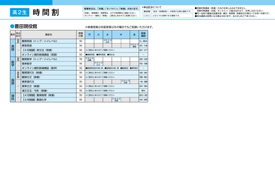授業形式は、「対面」「オンライン」「映像」があります。「対面」:授業曜日・時間帯は、以下の時間割をご確認ください。「オンライン(個別)」「映像」:ご都合にあわせてご受講ください。*申込区分について認定制「認定(受講資格)」の取得が必要な講座です。ーどなたでも受講できる講座です。●受験対策講座(映像)のみのお申し込みはできません。受験対策講座(対面/オンライン)と組み合わせて、お申し込みください。●同一名称の講座は設置校舎・曜日・時間帯・授業形式が異なっても同一内容です。●担当講師は変更になる場合があります。あらかじめご了承ください。※映像授業は対面授業以外の曜日でもご受講いただけます。授業分数9090909090909090909090909090月火水木金映像講映像講師師20:00〜21:30山本※ご都合にあわせてご視聴ください●標準英語●英文法●難関英語20:00〜21:30加藤20:00〜21:30山上20:00〜21:30渡部村上・髙橋(保)成川・大島成川・木下-依田・合田河合・吉嗣●難関理系数学中高一貫●難関数学中高一貫●難関数学●標準数学-※ご都合にあわせてご視聴ください※ご都合にあわせてご視聴ください※ご都合にあわせてご視聴ください※ご都合にあわせてご視聴ください※ご都合にあわせてご視聴ください19:00〜20:30若原20:00〜21:30平野光田・清水伊藤・菅井一路・斎藤田中・酒井野村長谷川・原田中村・若原高2生時間割豊田●豊田現役館教科申込区分講座名難関英語(トップ・ハイレベル)標準英語【4月開講】英文法(映像)オンライン個別指導講座(英語)難関数学(トップ・ハイレベル)標準数学オンライン個別指導講座(数学)難関現代文(映像)難関古文(映像)標準現代文標準古文(映像)漢文文法・句形(映像)【4月開講】難関物理(映像)【4月開講】難関化学認定制-認定制-認定制--英語数学国語理科1ページ●2025年度/51/中部/豊田/高2生/パターン6620/2025_51_4_449_32_20240815134738.csv校了時削除