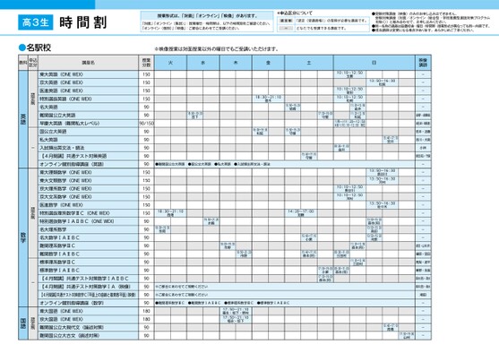 授業形式は、「対面」「オンライン」「映像」があります。「対面」「オンライン(集団)」:授業曜日・時間帯は、以下の時間割をご確認ください。「オンライン(個別)」「映像」:ご都合にあわせてご受講ください。*申込区分について認定制「認定(受講資格)」の取得が必要な講座です。ーどなたでも受講できる講座です。●受験対策講座(映像)のみのお申し込みはできません。受験対策講座(対面/オンライン〈総合型・学校推薦型選抜対策プログラムを除く〉)と組み合わせて、お申し込みください。●同一名称の講座は設置校舎・曜日・時間帯・授業形式が異なっても同一内容です。●担当講師は変更になる場合があります。あらかじめご了承ください。※映像授業は対面授業以外の曜日でもご受講いただけます。火水木金土日18:00〜19:30宮下18:30〜21:10登木13:50〜15:20岩崎18:00〜19:30松延13:50〜15:20守屋17:30〜19:00守屋10:10〜12:50玉置10:10〜12:5010:10〜12:50室田松岡11:20〜12:50金井11:20〜12:50松延1月〜)11:20〜12:504月〜)10:10〜12:50市位●難関国公立大英語●国公立大英語●私大英語●入試頻出英文法・語法09:30〜11:00金井15:40〜17:10守屋10:10〜12:50長谷川10:10〜12:50河村18:30〜21:10西畑18:00〜19:30笠岡19:50〜21:20水嶋18:00〜19:30市野19:50〜21:20市野14:20〜17:00加藤15:40〜17:10小栗15:40〜17:10森本(将)※ご都合にあわせてご視聴ください※ご都合にあわせてご視聴ください●難関理系数学ⅢC●難関数学ⅠAⅡBC●標準数学ⅠAⅡBC●標準理系数学ⅢC17:50〜21:10福永・坂下・野村17:50〜21:10福永・坂下11:20〜12:50森本(将)11:20〜12:50三田村09:30〜11:00三田村09:30〜11:00森本(将)17:30〜19:00小栗17:30〜19:00森本(将)13:50〜16:30松延15:40〜17:10笠井13:50〜16:30長谷川13:50〜16:30河村13:50〜16:30佐々木13:50〜15:20森本(将)13:50〜15:20高田13:50〜15:20河原15:40〜17:10高橋17:30〜19:00山村授業分数150150150150909090/150909090909015015015015015015090909090909090909090901801809090映像講映像講師師-----佐野・胡摩﨑柴田(卓)・髙橋(慶)安井・近藤吉川・大島小林柴田(祐)・守屋----------依田・山本田・山()原・宮田樋原高梨・波平秦野・永島森本(啓)・清水森本(啓)・清水湘田-----東大英語(ONEWEX)京大英語(ONEWEX)医進英語(ONEWEX)特別選抜英語(ONEWEX)名大英語難関国公立大英語早慶大英語(難関私大レベル)国公立大英語私大英語入試頻出英文法・語法【4月開講】共通テスト対策英語オンライン個別指導講座(英語)東大理類数学(ONEWEX)東大文類数学(ONEWEX)京大理系数学(ONEWEX)京大文系数学(ONEWEX)医進数学(ONEWEX)特別選抜理系数学ⅢC(ONEWEX)特別選抜数学ⅠAⅡBC(ONEWEX)名大理系数学名大数学ⅠAⅡBC難関理系数学ⅢC難関数学ⅠAⅡBC標準理系数学ⅢC標準数学ⅠAⅡBC【4月開講】共通テスト対策数学ⅠAⅡBC【4月開講】共通テスト対策数学ⅠA(映像)【4月開講】共通テスト対策数学C「平面上の曲線と複素数平面」映像)オンライン個別指導講座(数学)東大国語(ONEWEX)京大国語(ONEWEX)難関国公立大現代文(論述対策)難関国公立大古文(論述対策)認定制-認定制-英語数学認定制国語高3生時間割名駅校●名駅校教科申込区分講座名1ページ●2025年度/51/中部/名駅校/高3・卒生/パターン6620/2025_51_4_414_11_20240815134738.csv校了時削除
