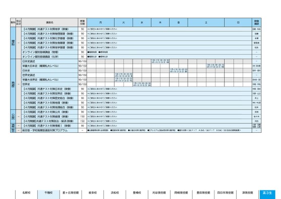 名駅校千種校星ヶ丘現役館岐阜校浜松校豊橋校刈谷現役館岡崎現役館豊田現役館四日市現役館津現役館高3生校了時削除-----●2025年度/51/中部/千種/高3・卒生/パターン6620/2025_51_4_413_11_20240815134738.csv●42公民情報総合理科地歴地歴5ページ●2025年度/51/中部/千種/高3・卒生/パターン6620/2025_51_4_413_11_20240815134738.csv●42校了時削除講座名講座名授業分数授業分数月月火火水水木木金金土土日日映像講日師映像講映像講師師※ご都合にあわせてご視聴ください合て聴ください90※ご都合にあわせてご視聴ください合て聴ください90※ご都合にあわせてご視聴ください合て聴ください90※ご都合にあわせてご視聴ください合て聴ください90※ご都合にあわせてご視聴ください合て聴ください90●難関物理90●難関物理準理●標準物理●難関化学90●難関化学準学●標準化学90/15090/15090/15090/15090/15090/1501月〜)19:20〜20:504月〜)18:10〜20:50中垣1月〜)19:20〜20:50418:10〜20:50中垣1月〜)19:20〜20:504月〜)18:10〜20:50酒井1)9:20〜20:504〜18:0〜20:50酒井1月〜)18:40〜20:104月〜)17:30〜20:10中垣1月〜)8:40〜20:104〜17:0〜20:10中垣1月〜)19:20〜20:504月〜)18:10〜20:50堤1月〜)19:20〜20:504月〜)18:10〜20:50平松1)9:20〜20:50月〜)1810〜20:50堤1)9:20〜20:504月〜18:0〜20:50平松1月〜)19:20〜20:504月〜)18:10〜20:50北村1)9:20〜20:504)18:0〜20:50北村※ご都合にあわせてご視聴ください合て聴ください90※ご都合にあわせてご視聴ください合て聴ください90※ご都合にあわせてご視聴ください合て聴ください90※ご都合にあわせてご視聴ください合て聴ください90※ご都合にあわせてご視聴ください合て聴ください90※ご都合にあわせてご視聴ください合て聴ください90※ご都合にあわせてご視聴ください合て聴ください150※ご都合にあわせてご視聴ください合て聴ください150※ご都合にあわせてご視聴ください合て聴ください90田島・松永田島・松永加藤本瀬加藤本瀬野黒美野黒美松永松永------大内・坂本(勝)大内・坂本(勝)田中・西川田中・西川--坂本(新)・沼田坂本(新)・沼田平尾・平松平尾・平松中垣・宮本中垣・宮本大野・山口大野・山口井上井上中村・中土居中村・中土居松本吉見松本吉見佐々木佐々木河合河合小野・加賀佐藤・山家小野・加賀佐藤・山家●出願書類対策(必須受講)●面接対策(選択制)●小論文対策(選択制)●【プレミアム】過去問対策(選択制)●慶大対策<(法)FIT●出願書類対策(必須受講)●面接対策(選択制)●小論文対策(択制)●【プレミアム】過去問対策(選択制)●慶大対策<(法)FITA方式/(法)FITA方式/(法)FITB方式/(文)自主応募制推薦>B方式/(文)自主応募制推薦>----90【4月開講】共通テスト対策地学(映像)【4月開講】共通テスト対策物理基礎(映像)【4月開講】共通テスト対策化学基礎(映像)【4月開講】共通テスト対策生物基礎(映像)【4月開講】共通テスト対策地学基礎(映像)オンライン個別指導講座(物理)オンライン個別指導講座(化学)日本史論述早慶大日本史(難関私大レベル)日本史世界史論述早慶大世界史(難関私大レベル)世界史-【4月開講】共通テスト対策日本史(映像)【4月開講】共通テスト対策世界史(映像)【4月開講】共通テスト対策歴史総合(映像)【4月開講】共通テスト対策地理(映像)【4月開講】共通テスト対策地理総合(映像)【4月開講】共通テスト対策公共(映像)【4月開講】共通テスト対策倫理(映像)【4月開講】共通テスト対策政治・経済(映像)【4月開講】共通テスト対策情報Ⅰ(映像)総合型・学校推薦型選抜対策プログラム【4月開講】共通テスト対策地学(映像)90【4月開講】共通テスト対策物理基礎(映像)90【4月開講】共通テスト対策化学基礎(映像)90【4月開講】共通テスト対策生物基礎(映像)90【4月開講】共通テスト対策地学基礎(映像)90オンライン個別指導講座(物理)90オンライン個別指導講座(化学)日本史論述早慶大日本史(難関私大レベル)日本史世界史論述早慶大世界史(難関私大レベル)世界史【4月開講】共通テスト対策日本史(映像)【4月開講】共通テスト対策世界史(映像)90【4月開講】共通テスト対策歴史総合(映像)90【4月開講】共通テスト対策地理(映像)90【4月開講】共通テスト対策地理総合(映像)90【4月開講】共通テスト対策公共(映像)90【4月開講】共通テスト対策倫理(映像)150【4月開講】共通テスト対策政治・経済(映像)150【4月開講】共通テスト対策情報Ⅰ(映像)90総合型・学校推薦型選抜対策プログラム--90--90/15090/15090/15090/15090/15090/150公民情報総合理科千種千種5ページ教科申込区分教科申込区分