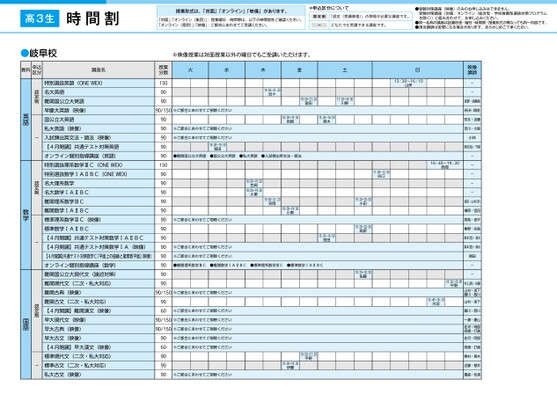 高3生時間割授業形式は、「対面」「オンライン」「映像」があります。「対面」「オンライン(集団)」:授業曜日・時間帯は、以下の時間割をご確認ください。「オンライン(個別)」「映像」:ご都合にあわせてご受講ください。*申込区分について認定制「認定(受講資格)」の取得が必要な講座です。ーどなたでも受講できる講座です。●受験対策講座(映像)のみのお申し込みはできません。受験対策講座(対面/オンライン〈総合型・学校推薦型選抜対策プログラムを除く〉)と組み合わせて、お申し込みください。●同一名称の講座は設置校舎・曜日・時間帯・授業形式が異なっても同一内容です。●担当講師は変更になる場合があります。あらかじめご了承ください。※映像授業は対面授業以外の曜日でもご受講いただけます。火水木金土90/150※ご都合にあわせてご視聴ください19:50〜21:20百々19:50〜21:20室田17:20〜18:50川野18:00〜19:30岩崎15:20〜16:50青木日13:30〜16:10山岸11:00〜12:30谷口16:40〜19:20西畑19:20〜20:50小田19:20〜20:50高原19:20〜20:50佐藤18:30〜20:00平野16:40〜18:10大田映像講映像講師師--佐野・胡摩﨑柴田(卓)・髙橋(慶)安井・近藤吉川・大島小林柴田(祐)・守屋-----依田・山本田・山()原・宮田樋原高梨・波平秦野・永島森本(啓)・清水森本(啓)・清水湘田--井上(真)・佐藤山村・坂下藤川・西川山村・坂下藤川・西川一瀬・菱山佐河・阿部髙橋・打越佐河・阿部髙橋・打越奥村・青木近藤・菅井重盛・松浦※ご都合にあわせてご視聴ください※ご都合にあわせてご視聴ください18:00〜19:30室田●難関国公立大英語●国公立大英語●私大英語●入試頻出英文法・語法18:00〜19:30笠岡18:00〜19:30小栗19:50〜21:20笠岡18:00〜19:30小栗15:20〜16:50宮田※ご都合にあわせてご視聴ください※ご都合にあわせてご視聴ください※ご都合にあわせてご視聴ください●難関理系数学ⅢC●難関数学ⅠAⅡBC●標準理系数学ⅢC●標準数学ⅠAⅡBC90/150※ご都合にあわせてご視聴ください9060※ご都合にあわせてご視聴ください90/150※ご都合にあわせてご視聴ください90/150※ご都合にあわせてご視聴ください9060909090※ご都合にあわせてご視聴ください※ご都合にあわせてご視聴ください※ご都合にあわせてご視聴ください19:50〜21:20平野18:00〜19:30伊藤授業分数1509090909090909015090909090909090909090909090特別選抜英語(ONEWEX)名大英語難関国公立大英語早慶大英語(映像)国公立大英語私大英語(映像)入試頻出英文法・語法(映像)【4月開講】共通テスト対策英語オンライン個別指導講座(英語)特別選抜理系数学ⅢC(ONEWEX)特別選抜数学ⅠAⅡBC(ONEWEX)名大理系数学名大数学ⅠAⅡBC難関理系数学ⅢC難関数学ⅠAⅡBC標準理系数学ⅢC(映像)標準数学ⅠAⅡBC【4月開講】共通テスト対策数学ⅠAⅡBC【4月開講】共通テスト対策数学ⅠA(映像)【4月開講】共通テスト対策数学C「平面上の曲線と複素数平面」映像)オンライン個別指導講座(数学)難関国公立大現代文(論述対策)難関現代文(二次・私大対応)難関古典(映像)難関古文(二次・私大対応)【4月開講】難関漢文(映像)早大現代文(映像)早大古典(映像)早大古文(映像)【4月開講】早大漢文(映像)標準現代文(二次・私大対応)標準古文(二次・私大対応)私大古文(映像)認定制-認定制-認定制-英語数学国語岐阜●岐阜校教科申込区分講座名1ページ●2025年度/51/中部/岐阜/高3・卒生/パターン6620/2025_51_4_412_11_20240815134738.csv阜1/校了時削除